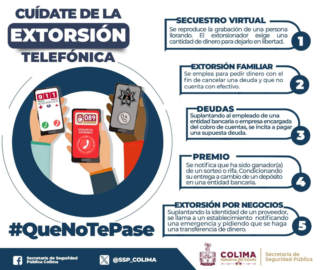 La Secretaría de Seguridad Pública (SSP) del Gobierno del Estado de Colima, informa a la ciudadanía sobre los diferentes tipos de extorsión telefónica que se han detectado recientemente y brinda recomendaciones para protegerse ante estas prácticas.