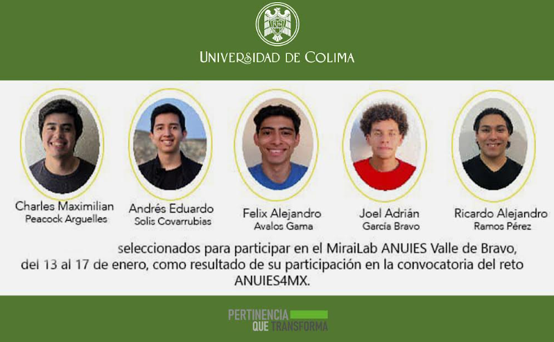 Cinco estudiantes de la Facultad de Telemática de la Universidad de Colima fueron seleccionados para participar en el MiraiLab ANUIES, un importante laboratorio de inteligencia artificial y neurociencias ubicado en Valle de Bravo, México. Los alumnos participarán del 13 al 17 de enero de 2025, tras destacar en la convocatoria Reto ANUIES4MX Rumbo a Japón 2025.