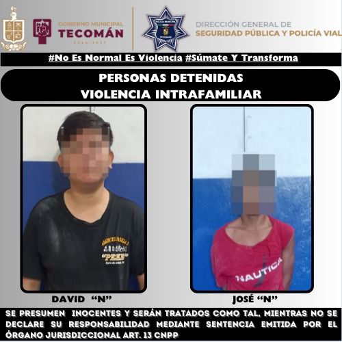 Como parte de las acciones estratégicas para Prevenir, Sancionar y Erradicar la Violencia contra las Mujeres en el Municipio de Tecomán, elementos adscritos a la Dirección General de Seguridad Pública y Policía Vial, detuvieron en acciones diferentes a dos masculinos en flagrancia identificados como David “N” y José “N”, por el delito de Violencia Intrafamiliar, mismos que fueron turnados de manera inmediata y sin demora a la autoridad competente para continuar con su proceso legal correspondiente.