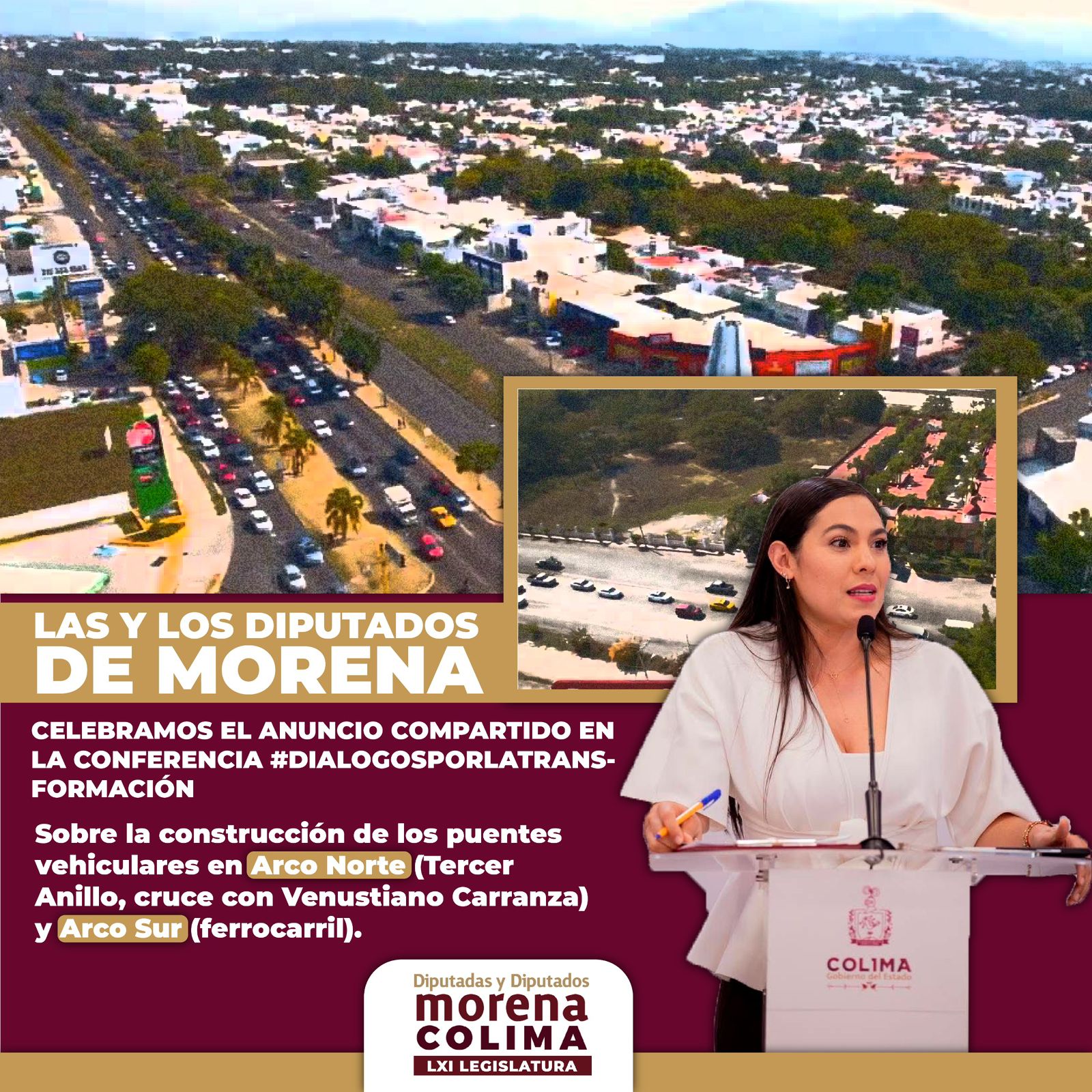 Las diputadas y diputados del Grupo Parlamentario de Morena en el Congreso del Estado de Colima, celebramos el anuncio hecho por la Gobernadora Indira Vizcaíno Silva, en relación a la construcción de dos puentes en la capital colimense, ya que eso demuestra la capacidad de gestión de la titular del ejecutivo, así como su empeño en seguir generando verdaderas Obras Que Transforman el día a día de las y los colimenses.