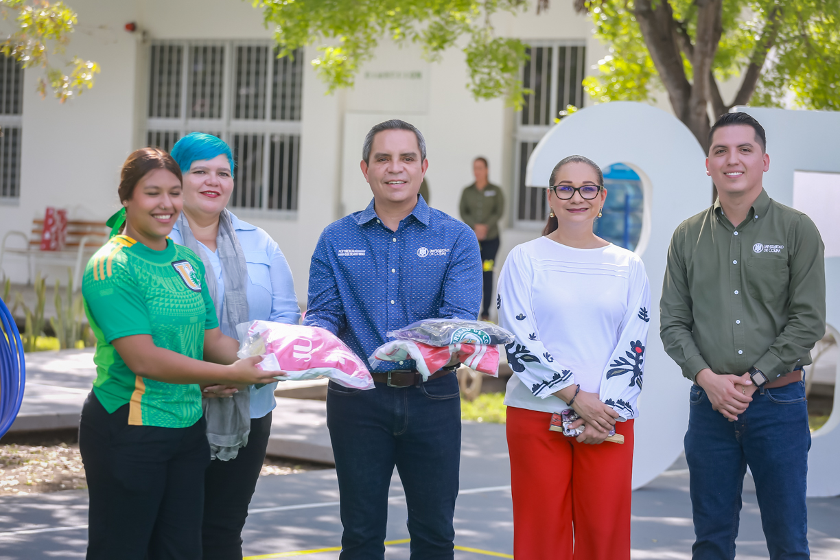 Al finalizar el evento, entregó material y uniformes deportivos a la delegada del campus y al director del plantel, reforzando su compromiso con la promoción del deporte en la institución.