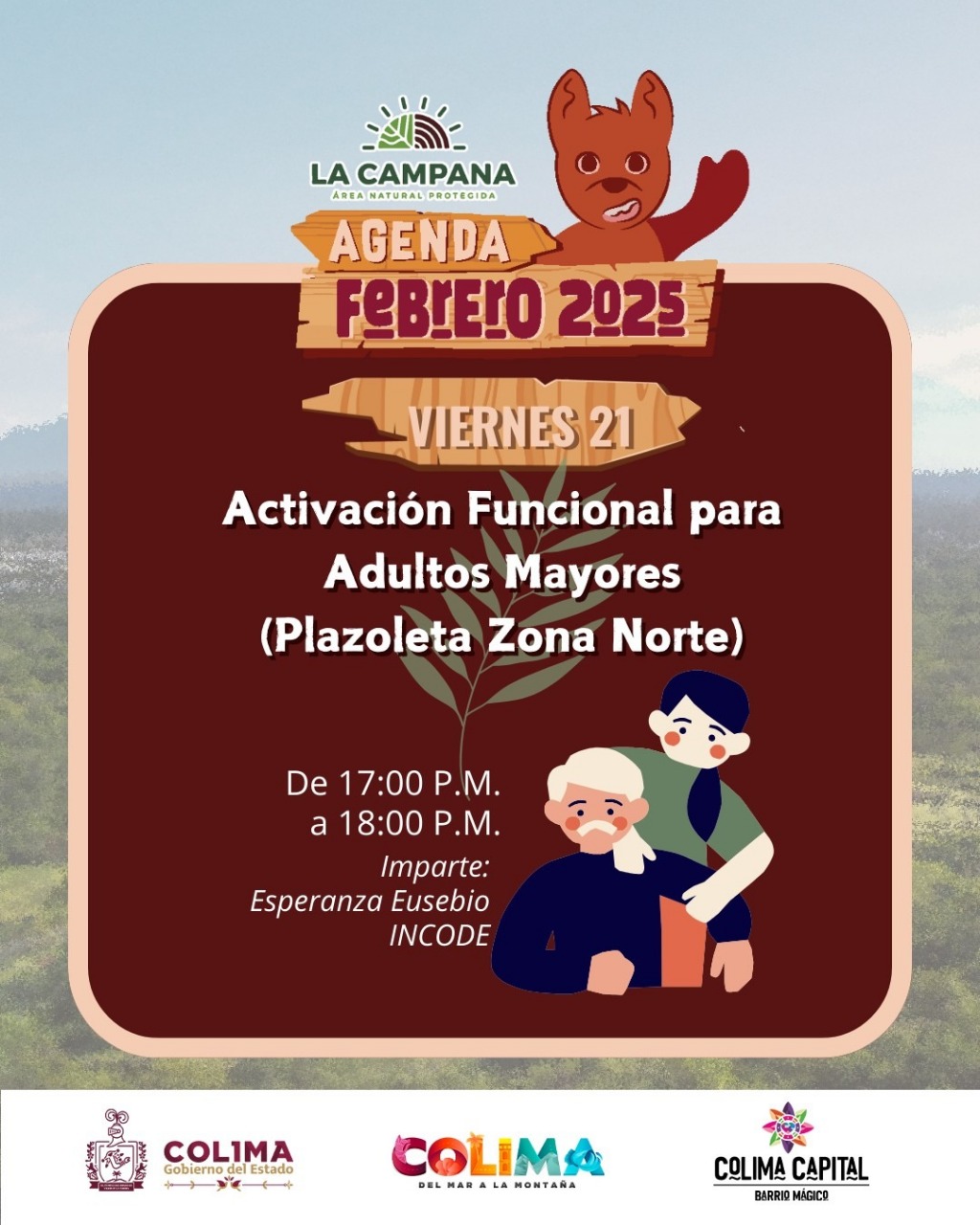El Instituto Colimense del Deporte (Incode), en coordinación con el Instituto Mexicano del Seguro Social (IMSS), invitan a toda la población a participar en la activación física gratuita para personas adultas mayores, que estará a cargo de la promotora Esperanza Eusebio, a realizarse este viernes 21 de febrero a partir de las 17:00 horas, en la zona norte del Área Natural Protegida ‘La Campana’, en la zona conurbada de Colima y Villa de Álvarez.