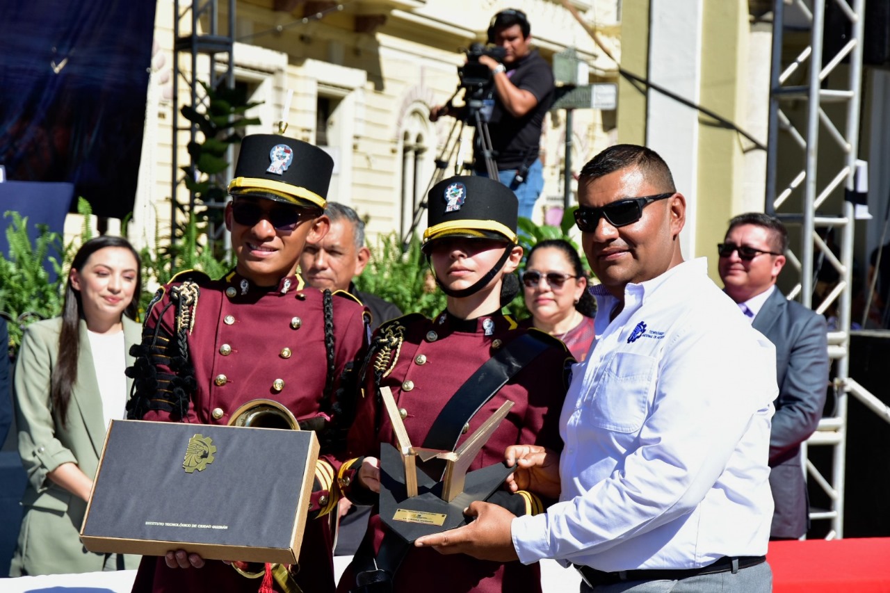Durante la ceremonia, las autoridades municipales y educativas entregaron reconocimientos a los promotores cívicos por su trayectoria de 15, 18 y hasta 20 años al frente de las bandas de guerra, así como a cada una de las delegaciones participantes.