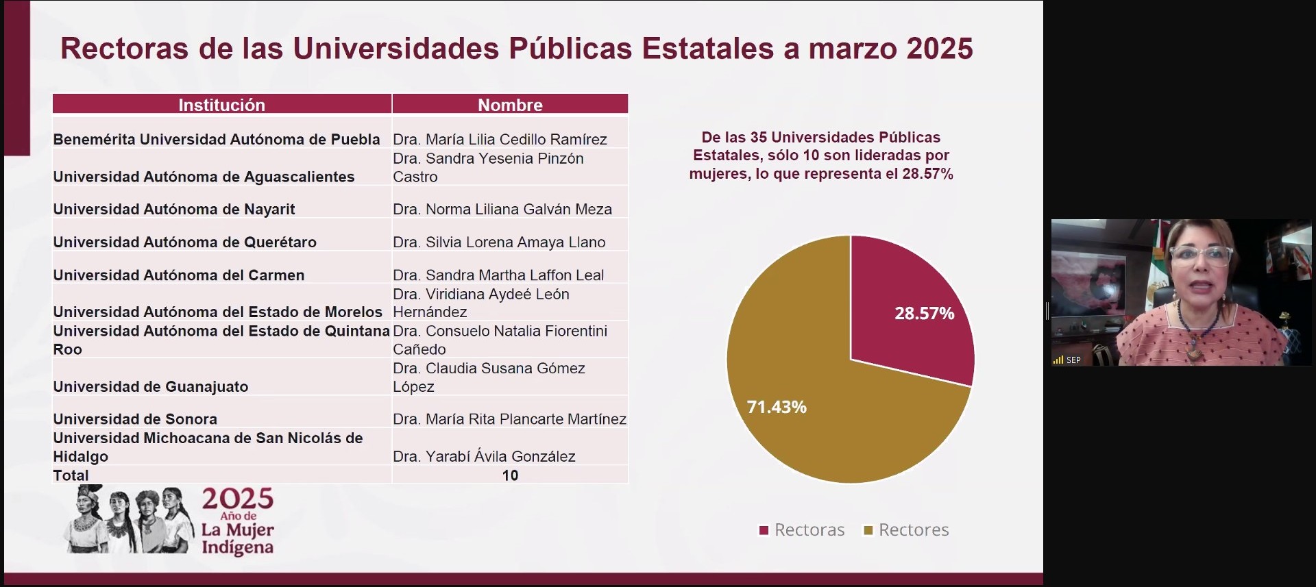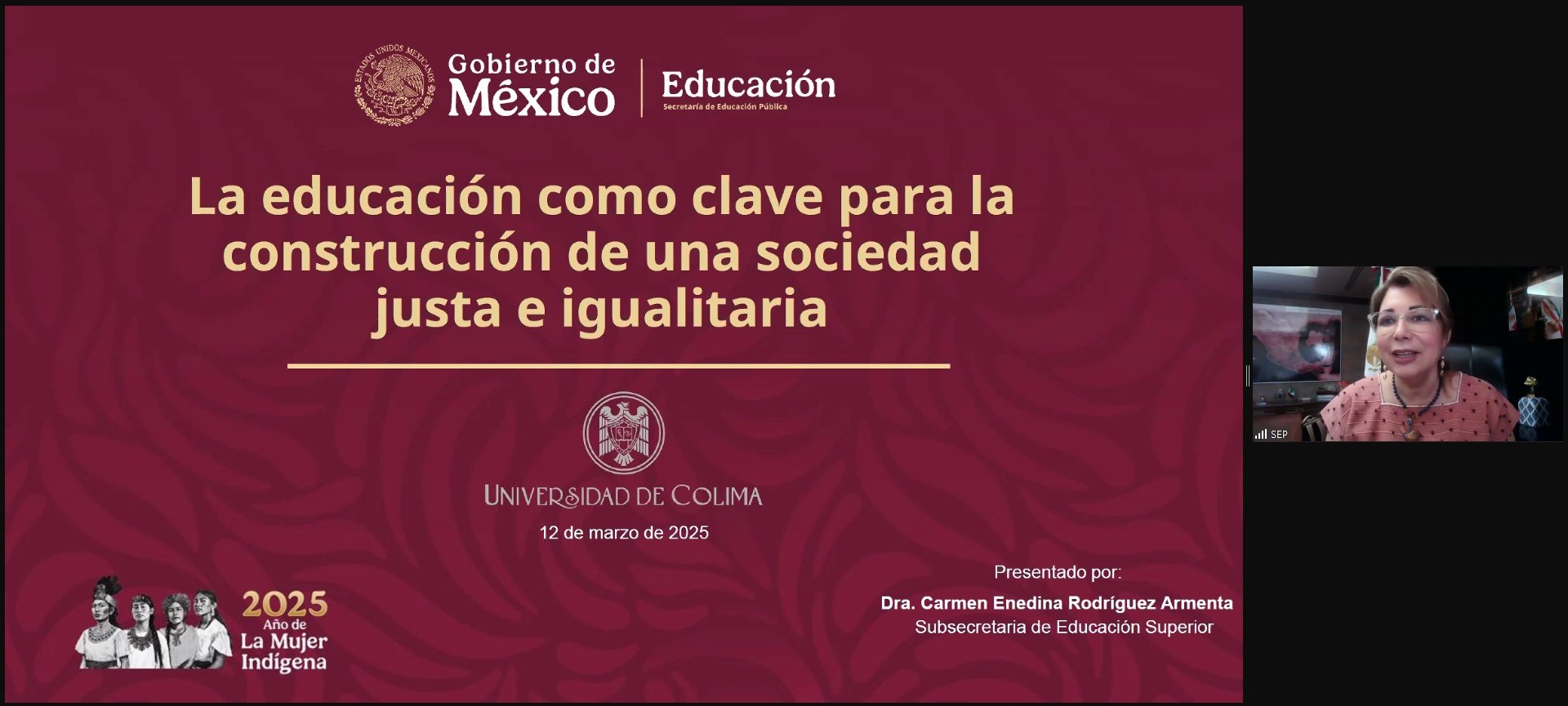 Como parte de las actividades conmemorativas por el Día Internacional de la Mujer, la Universidad de Colima organizó la conferencia magistral “La educación como clave para la construcción de una sociedad justa e igualitaria”, impartida vía Zoom por la Dra. Carmen Enedina Rodríguez Armenta, subsecretaria de Educación Superior de la SEP.