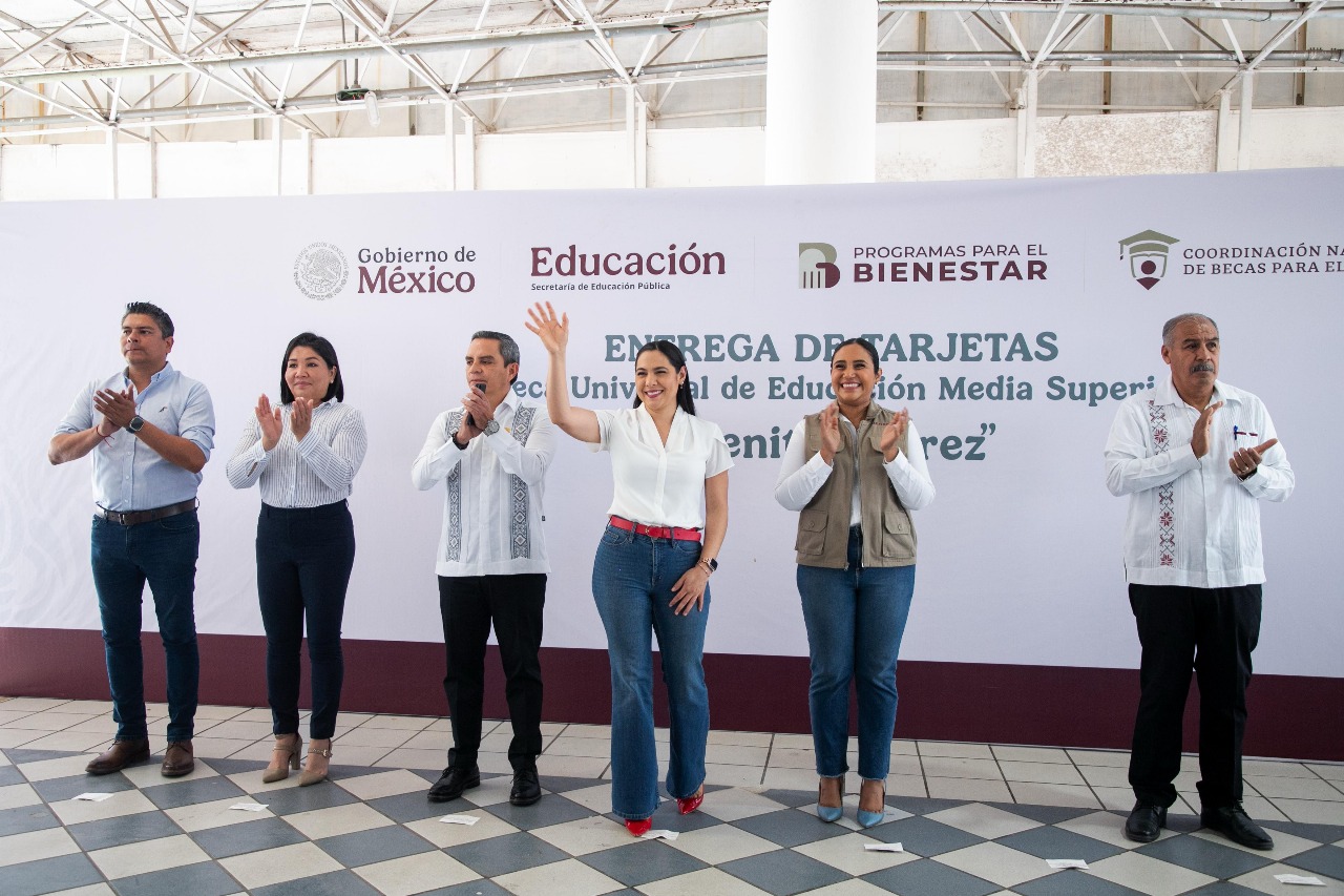 La gobernadora Indira Vizcaíno Silva participó en el arranque de la entrega de tarjetas bancarias de la beca universal para educación media superior ‘Benito Juárez’, a cerca de 700 estudiantes de distintas instituciones educativas, que realizó este jueves el Gobierno de México en instalaciones de la Feria de Colima, a través de la Coordinación Nacional de Becas para el Bienestar que encabeza Julio César León Trujillo.