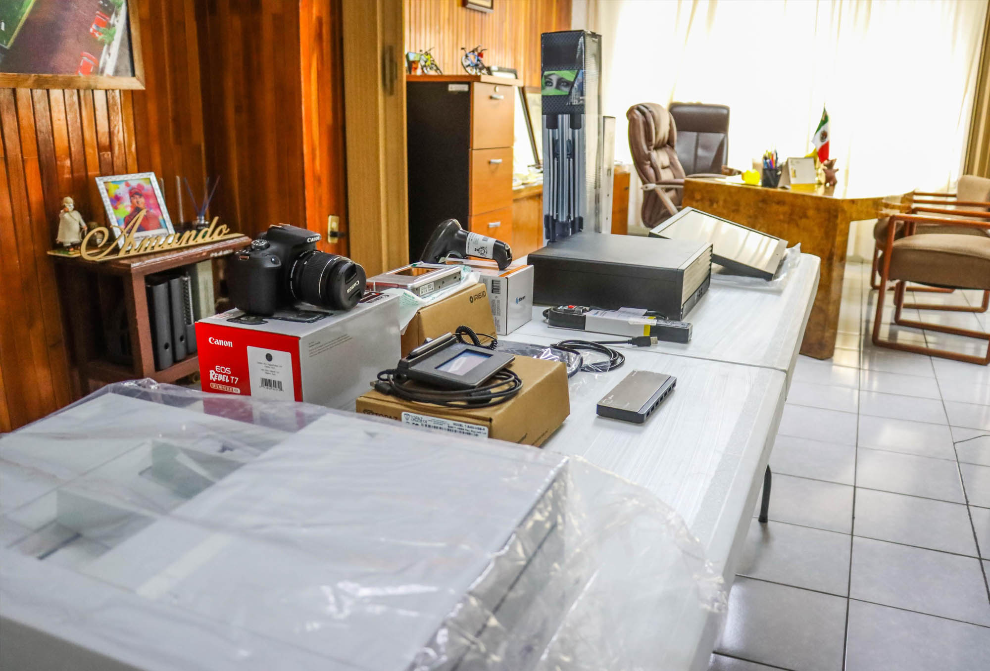 Entre los artículos entregados destacan: equipo biométrico, CPU, monitor, lector biométrico, cámara, scanner, tripié, lector de código de barras, equipo de firma electrónica, tp link, fondo fotográfico, multi contacto, adaptador, USB, iluminación led, kit de adaptador y un tripié para cámara profesional.