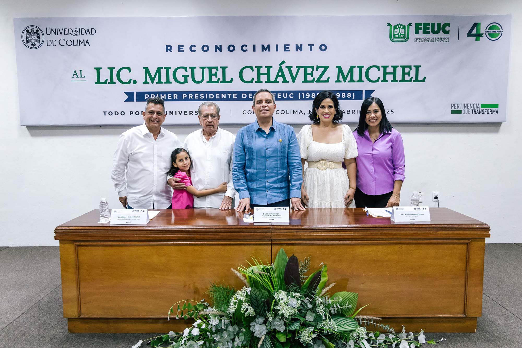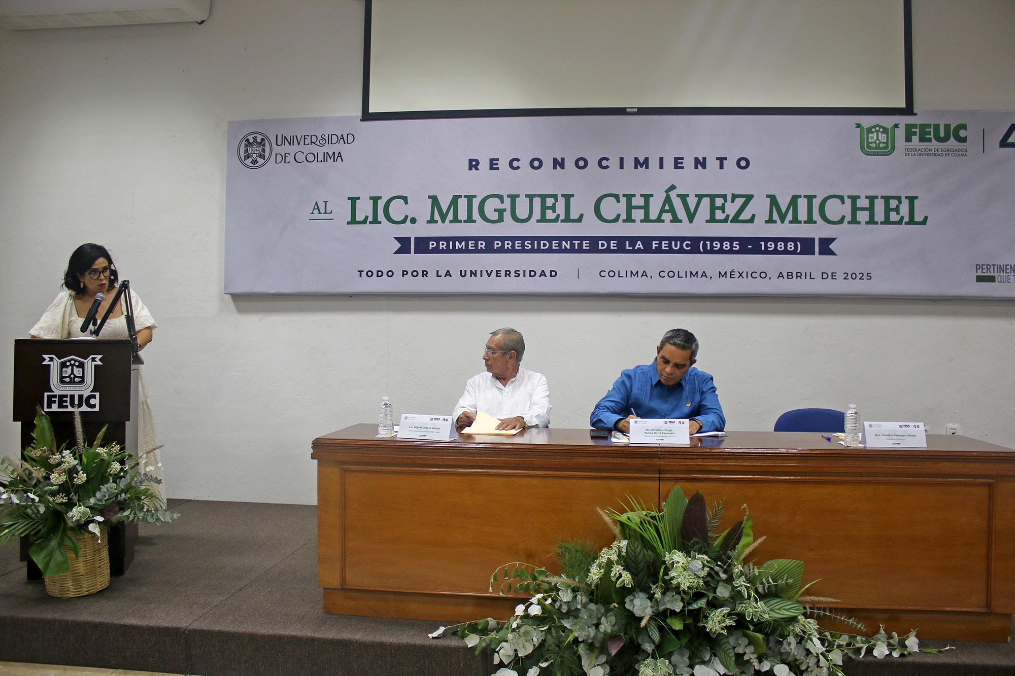 Por su parte, la presidenta de la FEUC, Carolina Venegas Ochoa dijo en su mensaje que los 40 años de vida de la FEUC, a cumplirse el próximo 6 septiembre, representan, más allá de una cifra, “una apuesta por la permanencia, la pertinencia y la identidad. En este trayecto, hay nombres que no pueden, ni deben, pasar desapercibidos. Uno de ellos es el del Licenciado Miguel Chávez Michel”.