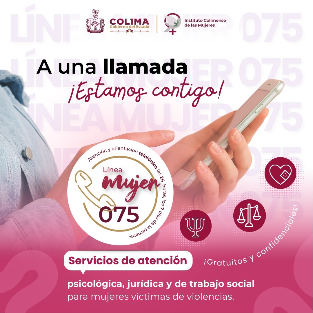 El Gobierno del Estado de Colima, a través del Instituto Colimense de las Mujeres (ICM), informa que la Línea Mujer 075 continúa a disposición las 24 horas durante los siete días de la semana en todo el año, brindando de manera gratuita asesoría legal y emocional a mujeres en situación de violencia.
