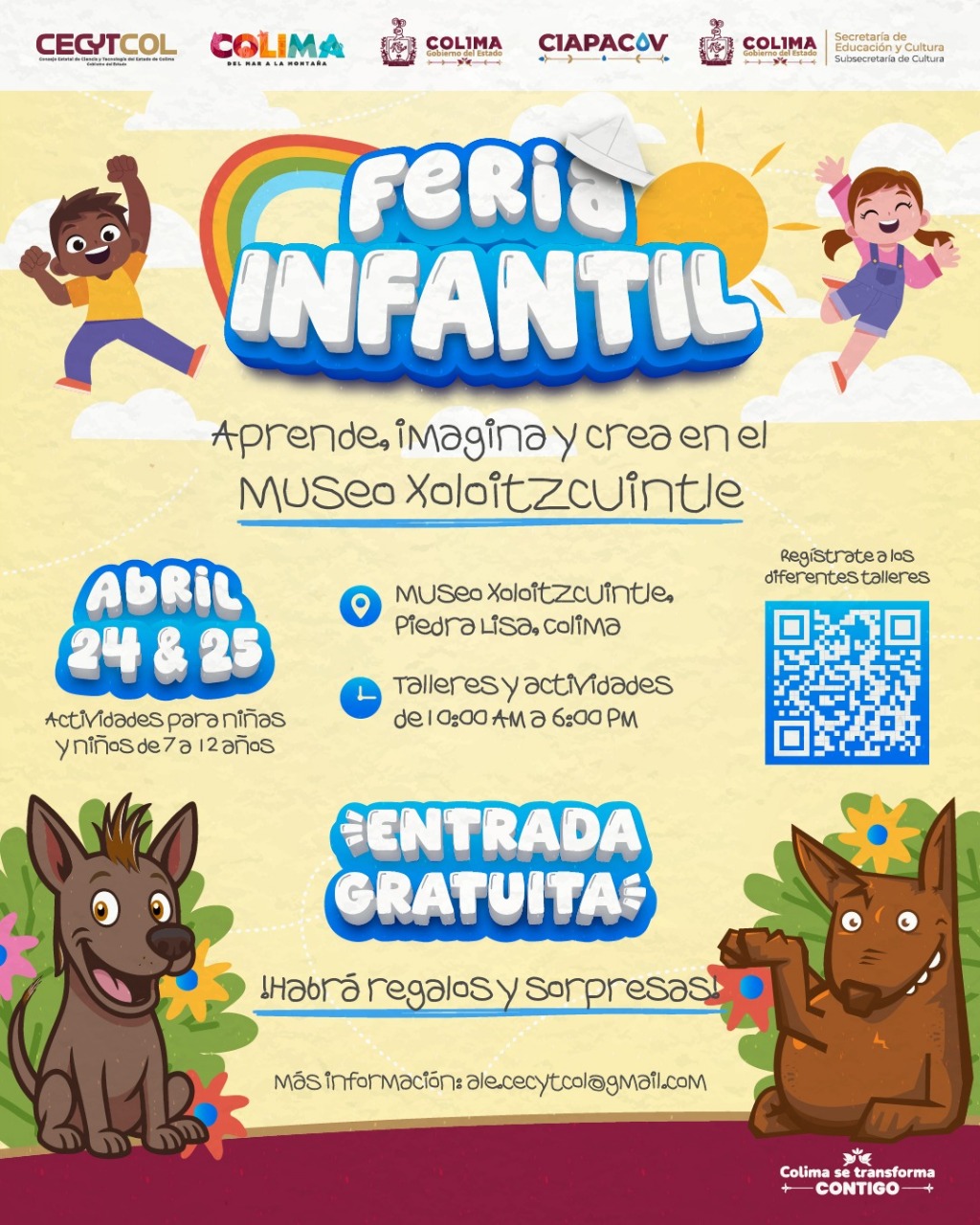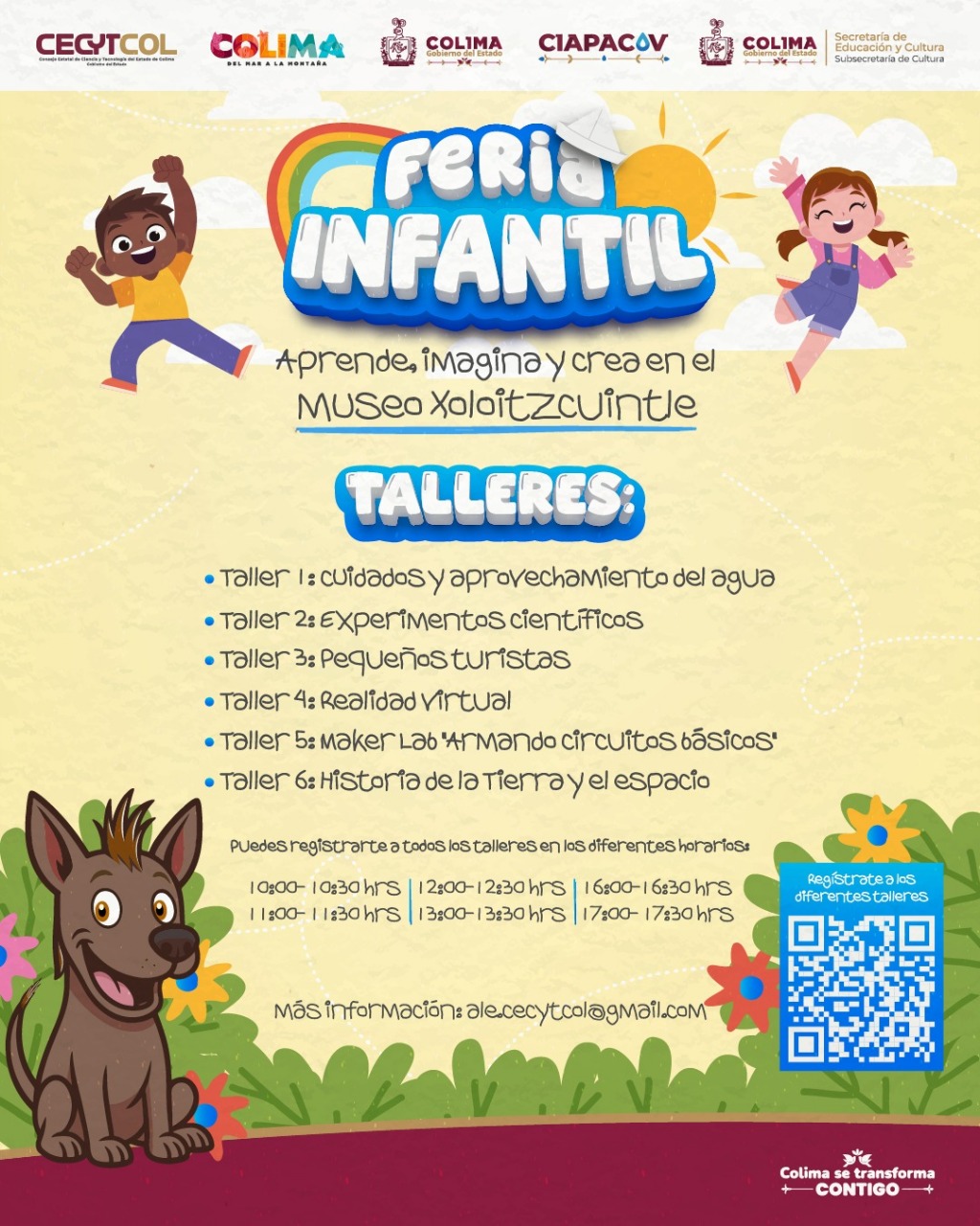 El Consejo Estatal de Ciencia y Tecnología del Estado de Colima (Cecytcol) llevará a cabo el próximo jueves 24 y viernes 25 de abril, de 10:00 de la mañana a 6:00 de la tarde, la Feria Infantil ‘Aprende, Imagina y Crea’ en el Museo Interactivo de Ciencia y Tecnología Xoloitzcuintle, que se ubica al fondo del Parque Piedra Lisa, en esta ciudad capital.