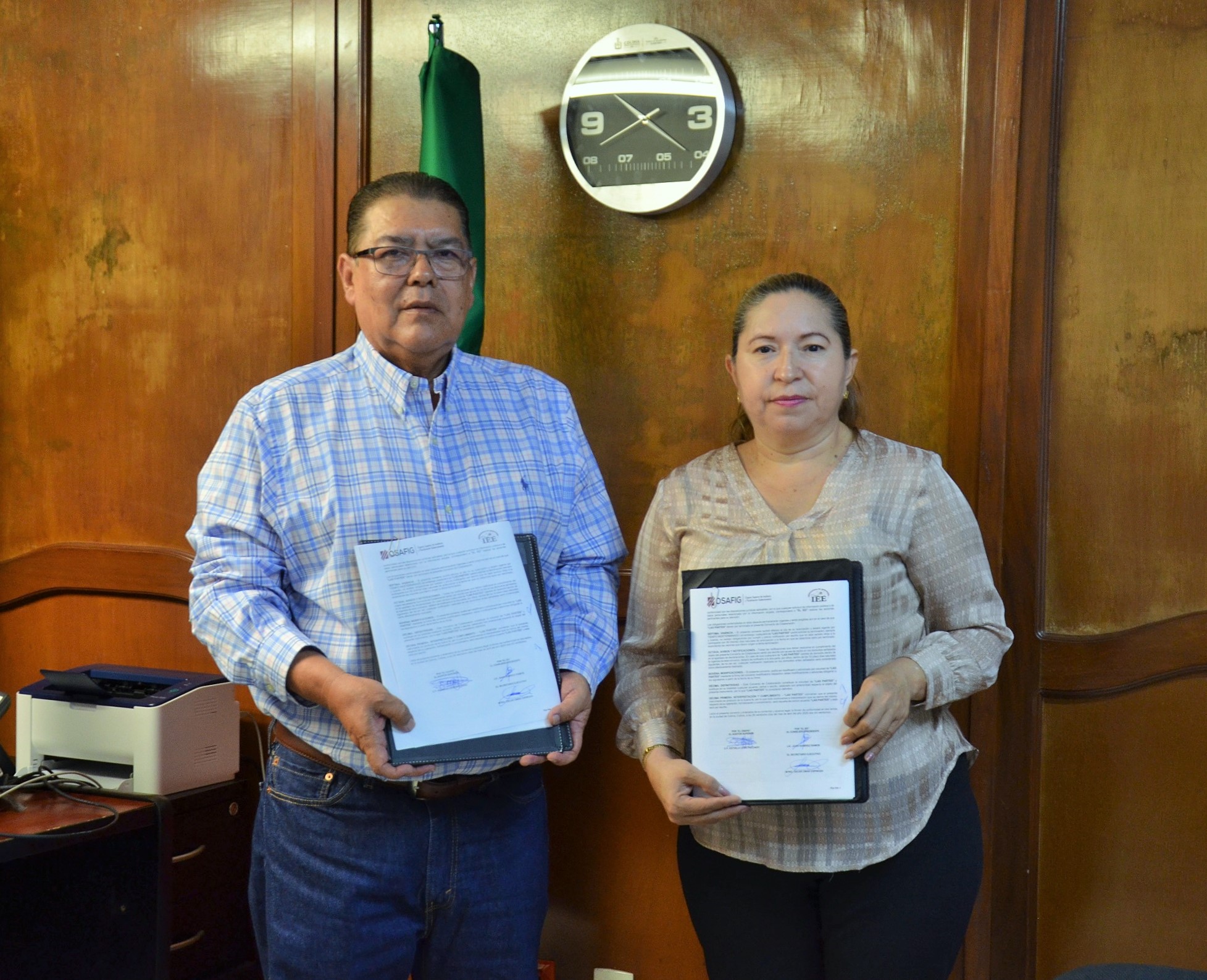 El Instituto Electoral del Estado de Colima (IEE) y el Órgano Superior de Auditoria y Fiscalización Gubernamental del Estado de Colima (Osafig), firmaron este lunes 28 de abril el Convenio de Colaboración, cuyo objeto consiste en otorgar al organismo electoral la concesión de licencia no exclusiva del Sistema de Declaración Patrimonial y de Intereses (SiDePat), así como el código fuente de los programas que lo integran.