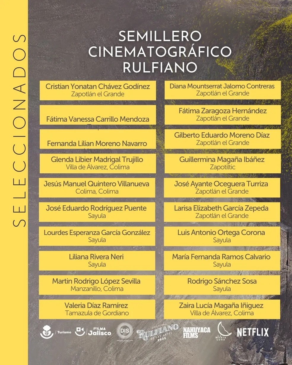 El Festival Rulfiano de las Artes, con sede en Sayula Jalisco, publicó los resultados de la convocatoria para el primer Semillero Cinematográfico Rulfiano, impulsado por el Fondo Netflix para la Equidad Creativa, y cuatro cineastas colimenses conforman la lista de 20 seleccionados, tres de ellos fueron beneficiados por la Residencia en Formación Cinematográfica que la Subsecretaría de Cultura del Gobierno del Estado de Colima realizó en 2024 en Manzanillo, con el objetivo de impulsar el desarrollo de nuevos talentos en el cine.