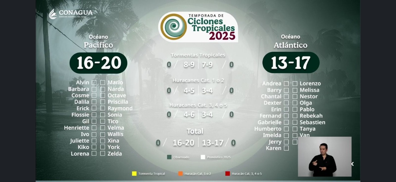 Conagua presentó la lista de 24 nombres asignados a cada uno de los huracanes, con base en su desarrollo y la intensidad de viento que alcancen: Alvin, Bárbara, Cosme, Dalila, Erick, Flossie, Gil, Henriette, Ivo, Juliette, Kiko, Lorena, Mario, Narda, Octave, Priscilla, Raymond, Sonia, Tico, Velma, Wallis, Xina, York y Zelda.