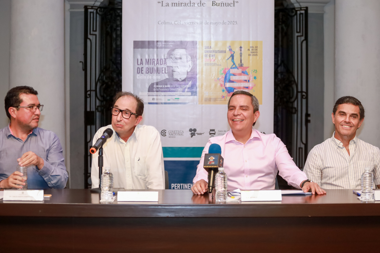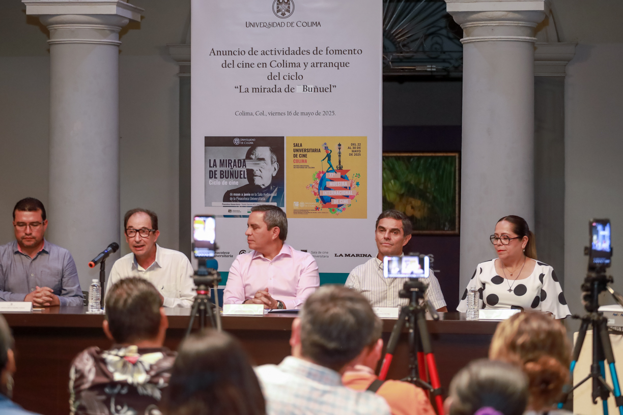 Con el propósito de fomentar el gusto por el cine clásico y de autor en Colima, este viernes, en rueda de prensa realizada en el salón del Vitral de la Pinacoteca Universitaria, la Universidad de Colima anunció una serie de actividades culturales que iniciarán con el ciclo de cine “La mirada de Buñuel”, a realizarse del 21 al 25 de mayo, y con el que se inaugurará la nueva Sala Audiovisual “Pony” de la propia Pinacoteca.