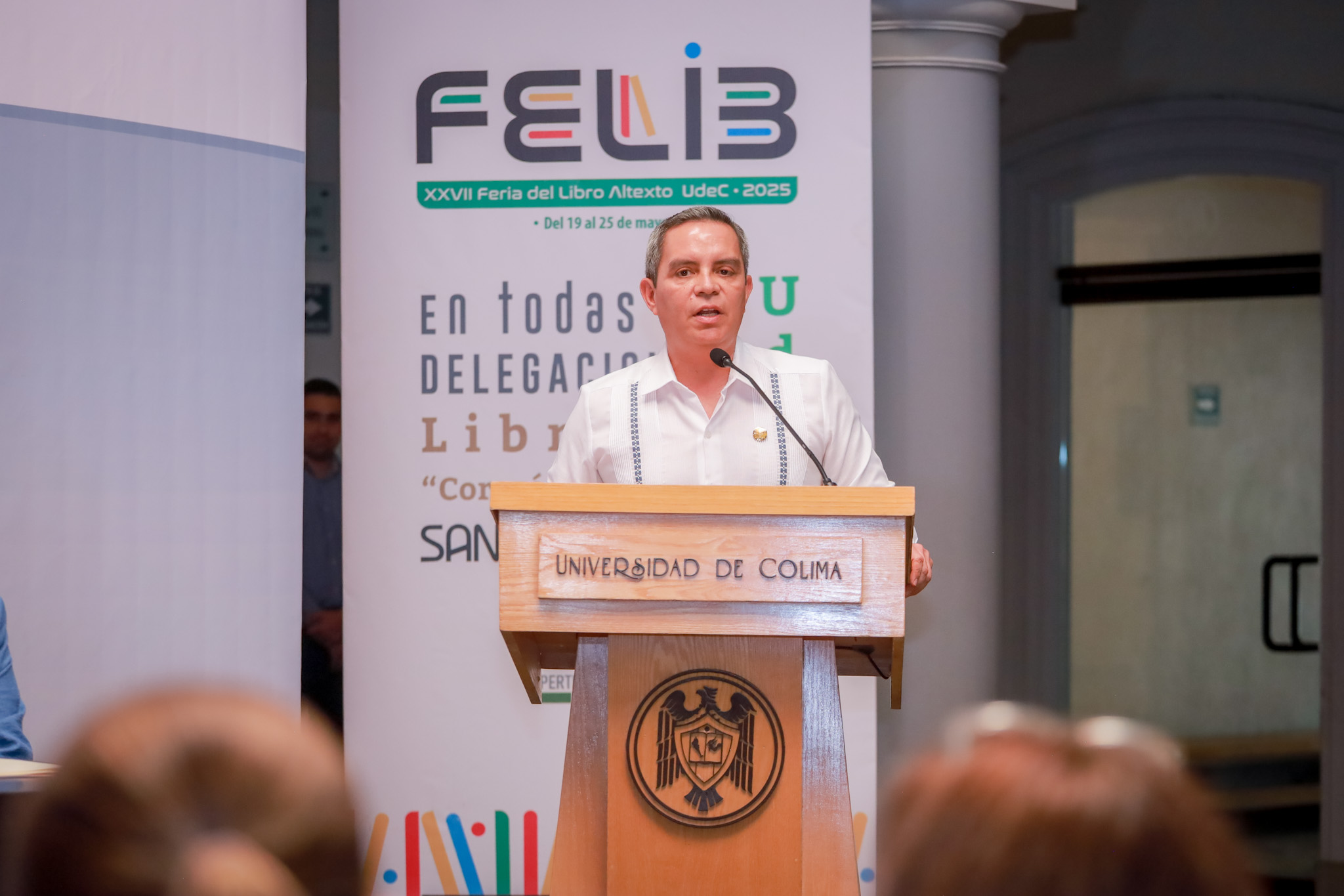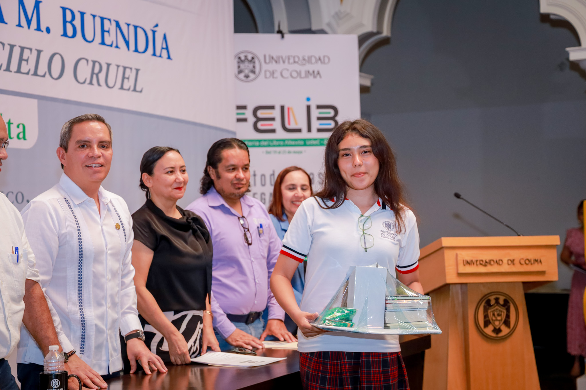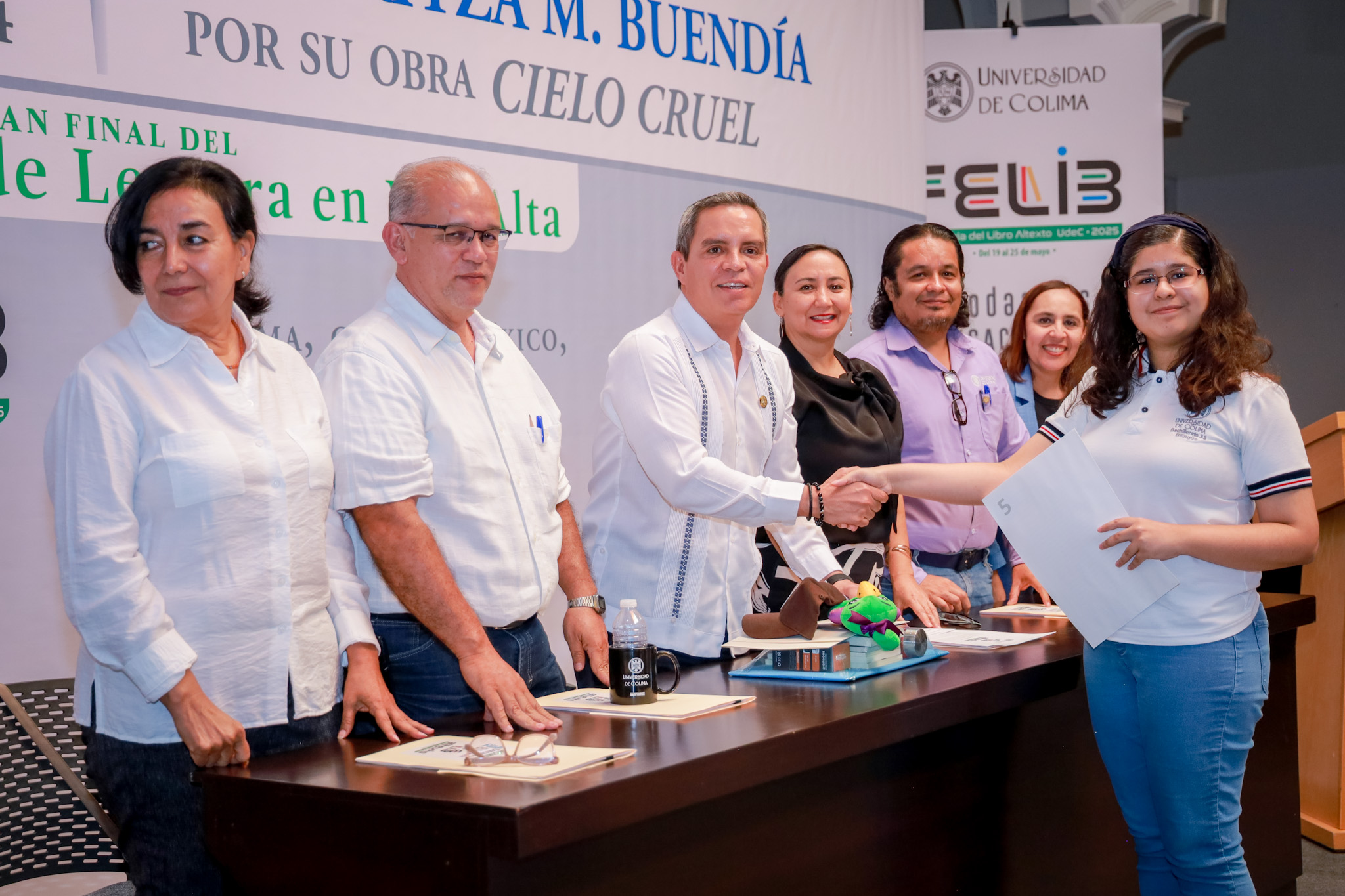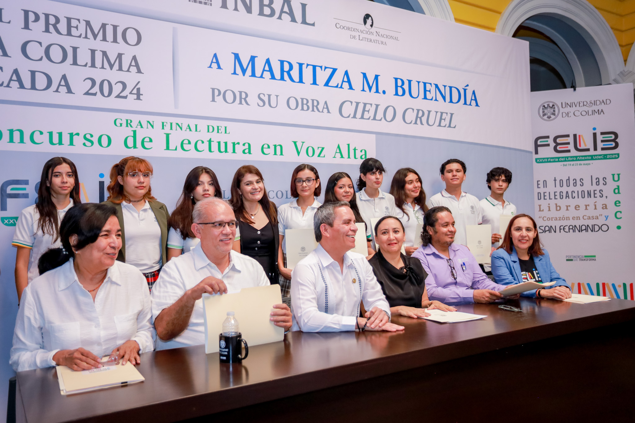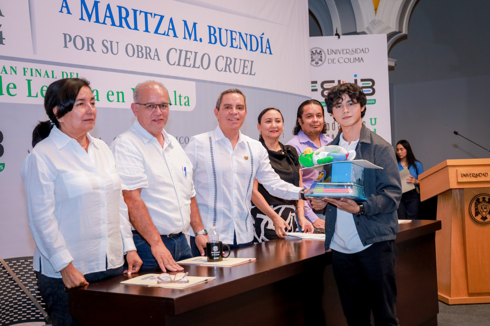 Para la competencia final, los concursantes leyeron un fragmento de la novela “Cielo cruel”, de la escritora Maritza M. Buendía, quien estuvo presente en el evento. Esta novela fue galardonada con el Premio Narrativa Colima por Obra Publicada 2025, premio que otorgan desde hace casi 50 años la Universidad de Colima y el Instituto Nacional de Bellas Artes y Literatura (INBAL).