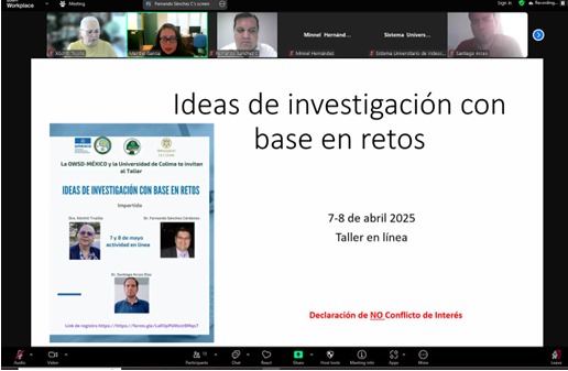 En días recientes, la Universidad de Colima, a través de su Coordinación General de Investigación y del Capítulo México de la Organización de Mujeres en la Ciencia para el Mundo en Desarrollo (OWSD), realizaron de manera virtual el taller “Ideas de investigación con base en retos”, con el objetivo de fortalecer las habilidades de científicas y científicos para generar propuestas de investigación socialmente pertinentes, innovadoras y viables.
