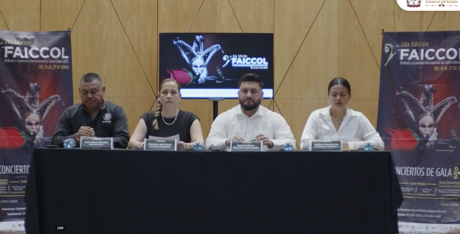 Este miércoles, autoridades culturales y universitarias ofrecieron una rueda de prensa en el Museo del Palacio para presentar los detalles de la segunda edición del Festival y Academia Internacional de Canto Colima 2025 (FAICCOL), que se realizará del 16 al 27 de junio en la Pinacoteca Universitaria, el Teatro Hidalgo y el Teatro Universitario “Coronel Pedro Torres Ortiz”.