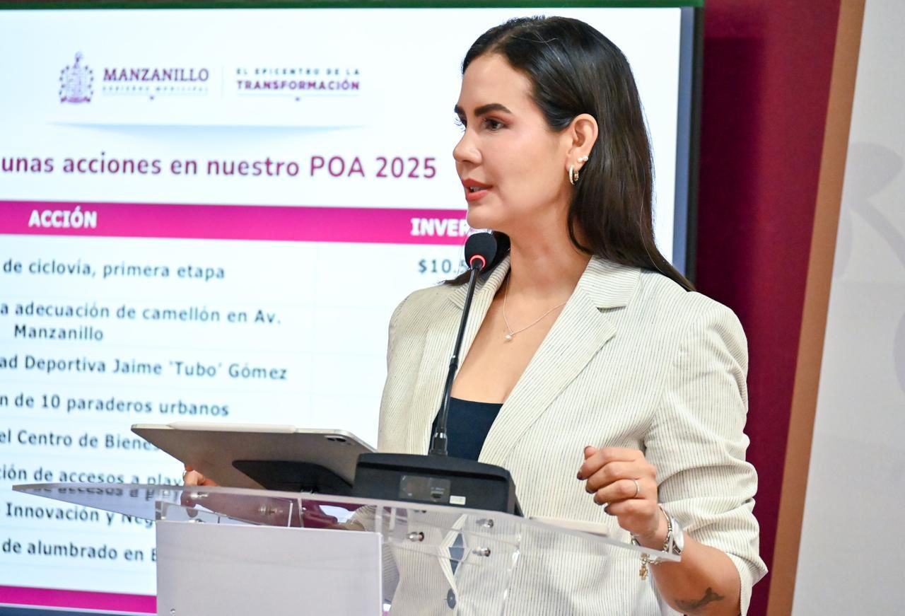 La edil manzanillense destacó algunas de las acciones que se contemplan en el POA 2025 como la primera etapa de la adecuación de la ciclovía, la rehabilitación de la Unidad Deportiva Jaime “Tubo” Gómez, la primera etapa de la adecuación del camellón en avenida Manzanillo, la primera etapa del Centro de Bienestar Animal, la rehabilitación de alumbrado público en el Barrio IV, la rehabilitación de accesos a playas, la Agencia de Innovación y Negocios y la modernización de paraderos.