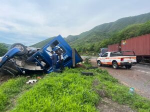 La Unidad Estatal de Protección Civil (UEPC) del Gobierno del Estado de Colima informa que la tarde de este jueves se registra la volcadura de un tractocamión sobre la autopista Colima-Manzanillo, a la altura de La Salada.
