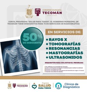 Como parte del compromiso con el bienestar y la salud de la población, el Gobierno Municipal de Tecomán, a través del programa “Salud para Todos”, ofrece a las y los ciudadanos 50% de descuento en diversos servicios de diagnóstico médico.