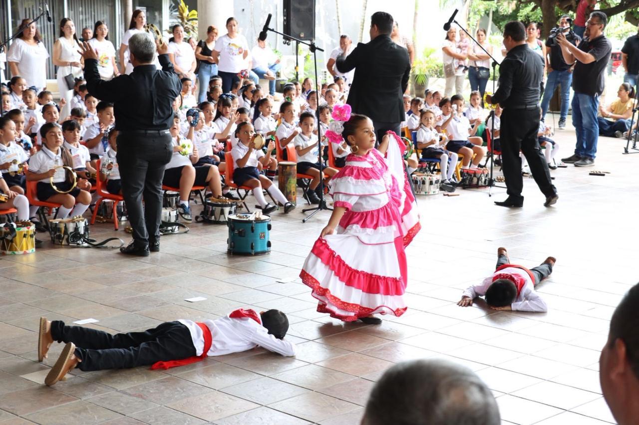 Acompañado por la subsecretaria de Educación, Katia Paola Vázquez Solórzano, personal de la dependencia, el titular de la SEyC expuso que esta muestra consistió en una orquesta infantil conformada por niñas y niños de preescolar, quienes, guiados por acompañantes de música y sus educadoras, interpretaron diversas piezas del folclor colimense.
