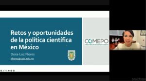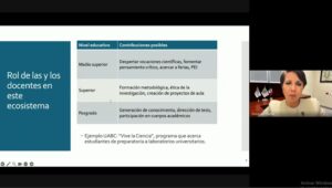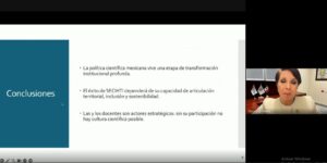 En su conferencia, la vicepresidenta de la COMEPO presentó a los y las docentes un panorama general del sistema científico en el país desde la creación del CONACyT en 1970 y su transición al CONAHCYT, hasta su transformación en la Secretaría de Ciencia, Humanidades, Tecnología e Innovación (SECIHTI).