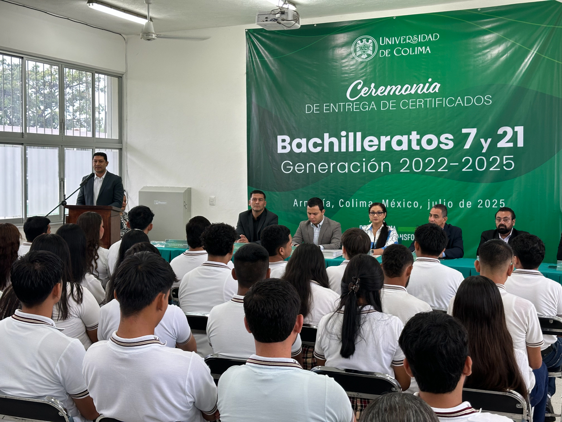 Asimismo, el director del Bachillerato 7, Jesús Anárbol Cayeros Sánchez, enfatizó que la Universidad de Colima está comprometida con la calidad y que estos tres años han sido de trabajo conjunto entre autoridades, docentes y estudiantes, para brindarles la mejor preparación para la vida académica y laboral. “Hoy egresan 45 jóvenes de buena cosecha, con metas claras y de los que pronto sabremos de sus éxitos”.