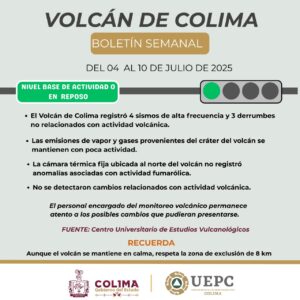 La Unidad Estatal de Protección Civil (UEPC) del Gobierno del Estado de Colima informa que, durante la reciente semana del 4 al 10 de julio, el Volcán de Fuego registró cuatro sismos de alta frecuencia y tres derrumbes, sin que esto represente cambios en la actividad volcánica, pues permanece en ‘semáforo verde’; es decir, el coloso sigue en calma.