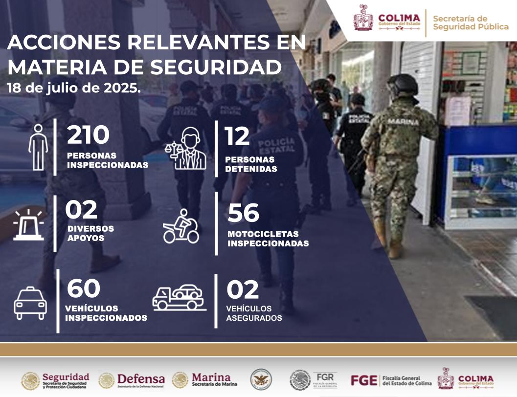 Además de estas detenciones, ambas corporaciones realizaron recorridos de prevención, vigilancia y disuasión del delito en las principales avenidas, colonias y zonas de convivencia de los diez municipios del estado, con el objetivo de preservar el orden público y garantizar la seguridad de las y los colimenses.