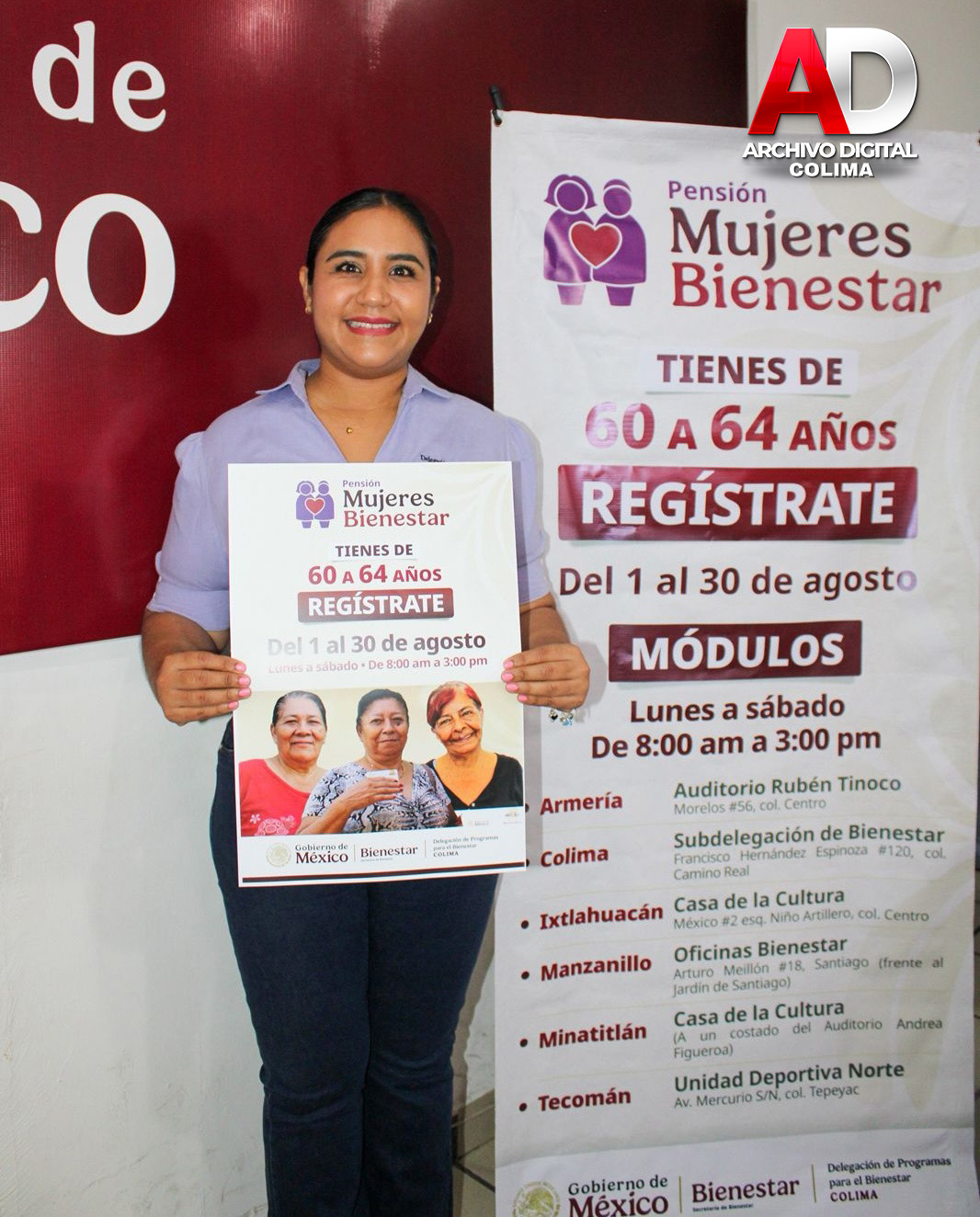 La delegada de Programas para el Bienestar en Colima, Rosario Silva Verduzco, informó que del 1 al 30 de agosto se llevará a cabo la incorporación de mujeres de 60 a 64 años a la Pensión Mujeres Bienestar, en cumplimiento al compromiso que hizo nuestra presidenta, Claudia Sheinbaum Pardo, con este sector de la población.