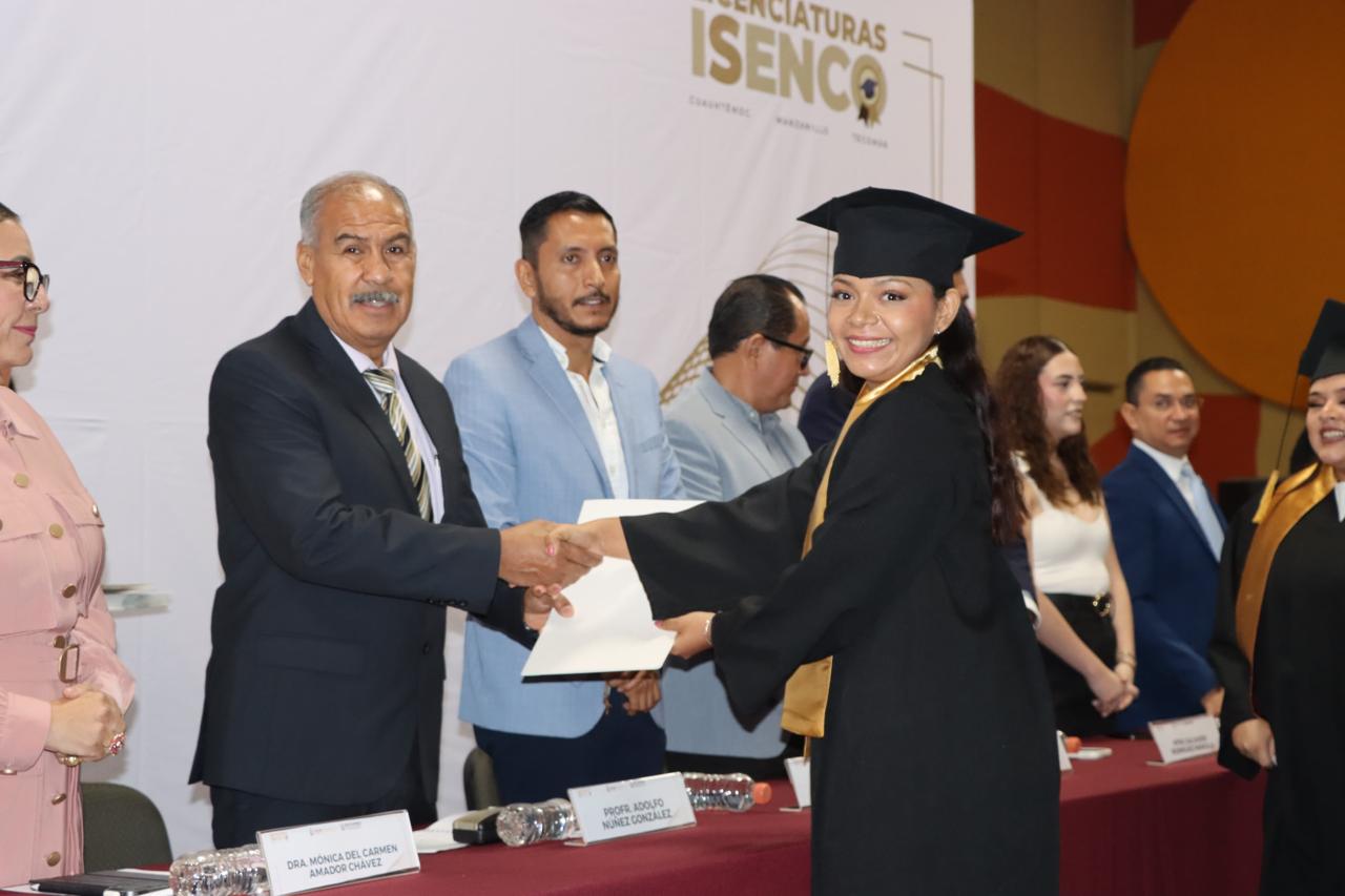 El titular de Educación compartió la satisfacción de egresadas y egresados de licenciaturas y bachillerato, por culminar esta etapa en sus vidas; reconoció que son una generación que se distinguió por su dedicación, gracias al esmero de autoridades y docentes del Isenco para desarrollar su trabajo; son 178 estudiantes de bachillerato y destacando que de los 201 estudiantes del nivel superior que conforman la generación 2021-2025, están egresando 188 ya con título y trece más se titularán en enero.