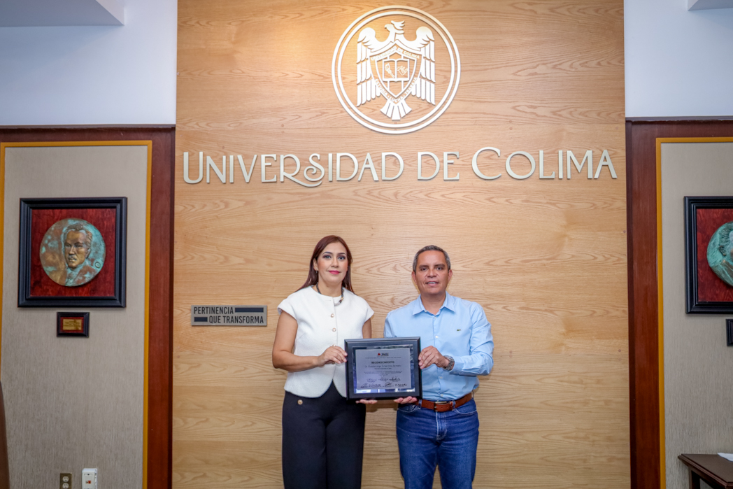 Este viernes, en un breve encuentro, el rector de la Universidad de Colima, Christian Jorge Torres Ortiz Zermeño, recibió en la sala de juntas de Rectoría a Ana Margarita Torres Arreola, vocal ejecutiva de la Junta Local del Instituto Nacional Electoral (INE) en Colima, quien entregó un reconocimiento a la Casa de Estudios por su colaboración en el programa de promoción de la participación ciudadana durante el pasado proceso electoral del Poder Judicial de la Federación.