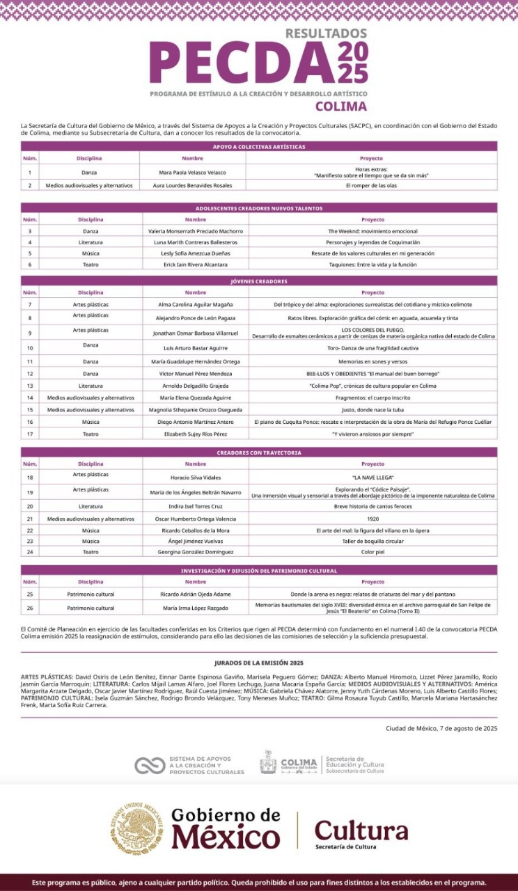 La Subsecretaría de Cultura del Gobierno del Estado de Colima, en coordinación con la Secretaría de Cultura del Gobierno de México, publica la lista de los 26 proyectos que recibirán incentivos económicos de hasta 70 mil pesos, a través del Programa de Estímulos a la Creación y Desarrollo Artístico (PECDA) Colima 2025, para realizar obras y propuestas creativas en teatro, danza, música, literatura, artes plásticas, medios audiovisuales y alternativos, y proyectos de rescate y difusión del patrimonio cultural.