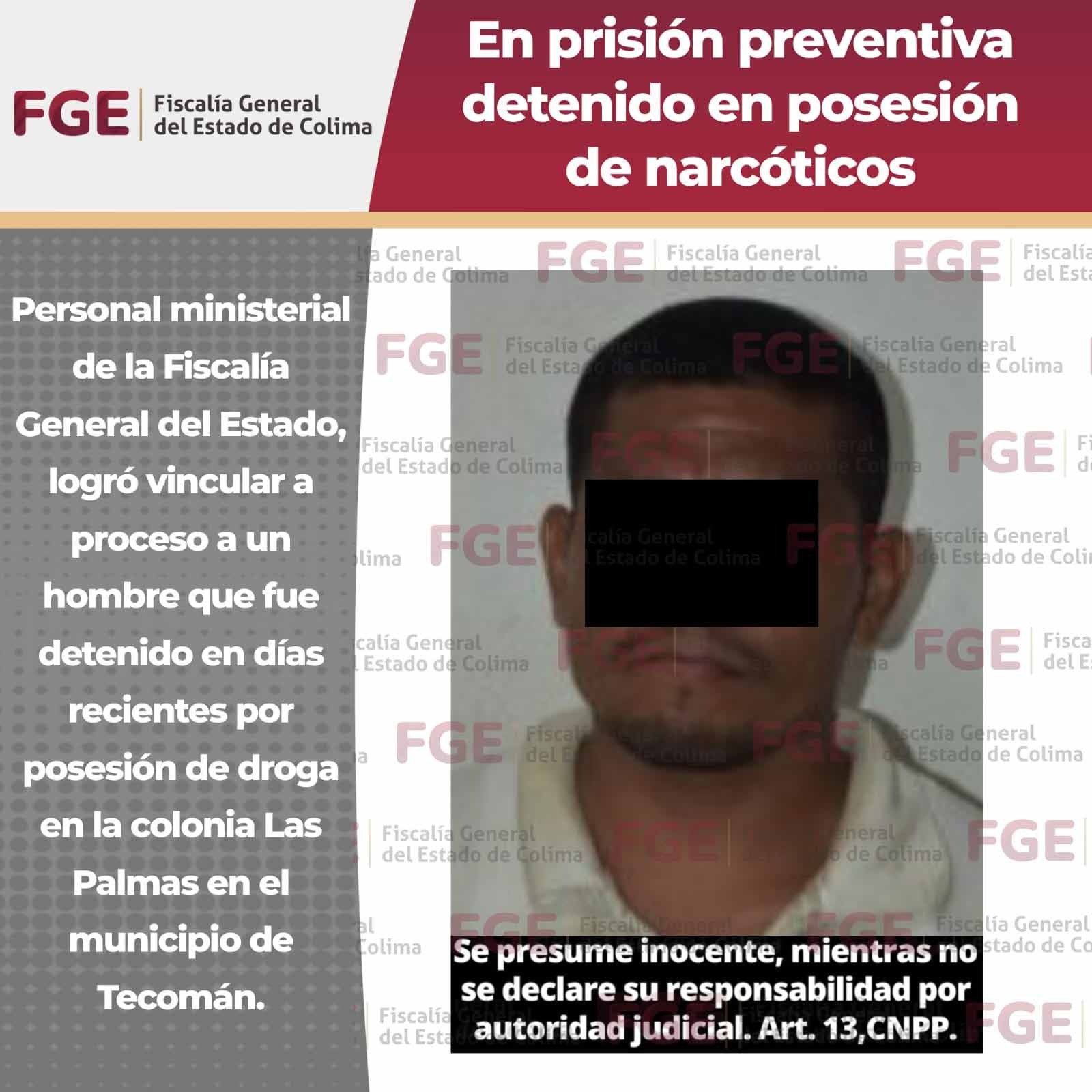 Personal ministerial de la Fiscalía General del Estado, logró vincular a proceso a un hombre que fue detenido en días recientes por posesión de droga en la colonia Las Palmas en el municipio de Tecomán.