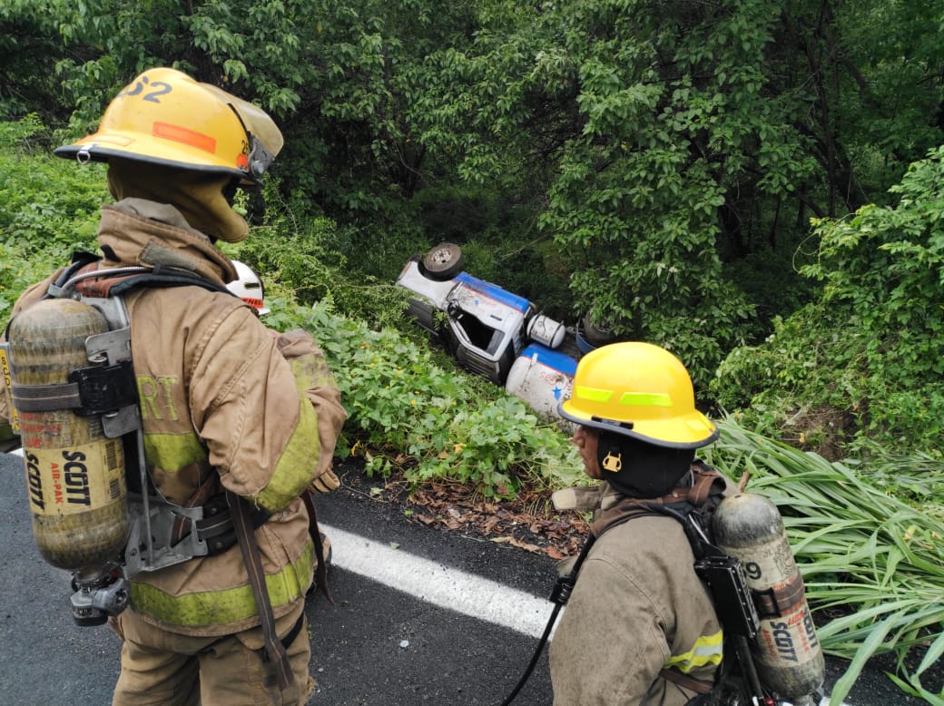 La Unidad Estatal de Protección Civil (UEPC) del Gobierno del Estado de Colima informa que este jueves se registró un accidente de tránsito sobre la carretera Manzanillo a Camotlán de Miraflores, cercano a la comunidad de La Lima, en el municipio porteño, en el que un vehículo de cuatro toneladas que se utiliza para distribuir gas LP, perdió el control y salió del camino, terminando volcado en un pequeño barranco de aproximadamente cuatro metros de profundidad.