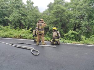 Personal operativo de la Unidad Municipal de Protección Civil, en coordinación con Bomberos Voluntarios de Manzanillo, se trasladaron al lugar y realizaron trabajos para contener la fuga, reducir los riesgos y auxiliar en los trabajos para la recuperación de la unidad de forma segura.