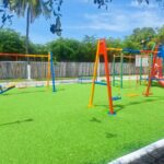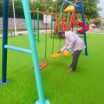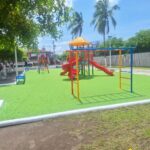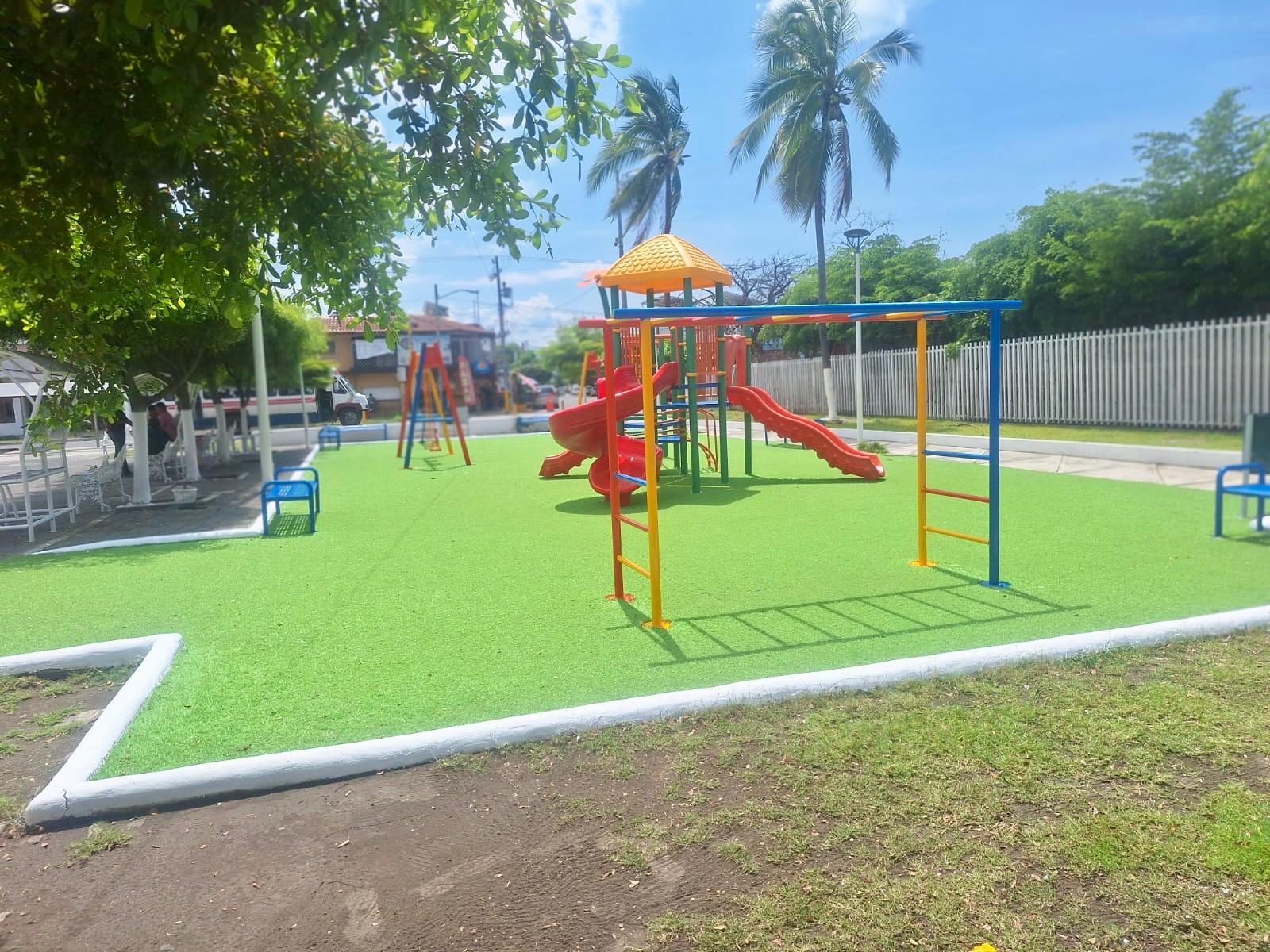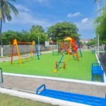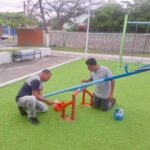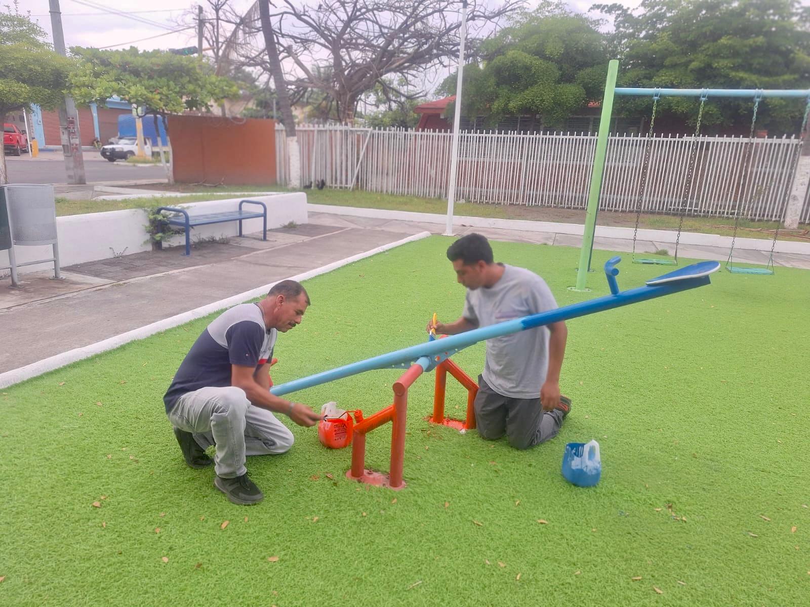 Las acciones realizadas incluyeron la rehabilitación del área de juegos infantiles, la aplicación de pintura en gradas, bancas y otras zonas del parque, así como el mantenimiento de las áreas verdes con poda de árboles, pintado de troncos y machuelos.