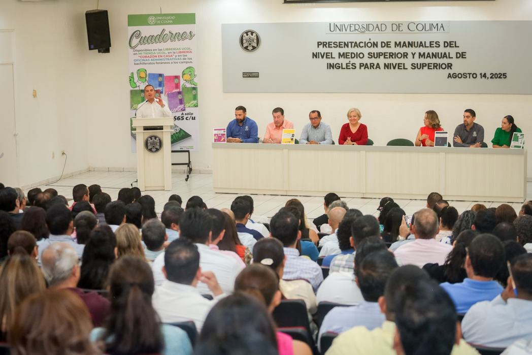 Este jueves, en el auditorio de la Facultad de Enfermería, el rector de la Universidad de Colima, Christian Torres Ortiz Zermeño presentó los nuevos manuales para el Nivel Medio Superior y el manual de inglés para el Nivel Superior, resultado del trabajo colaborativo de docentes universitarios y de varias dependencias universitarias.