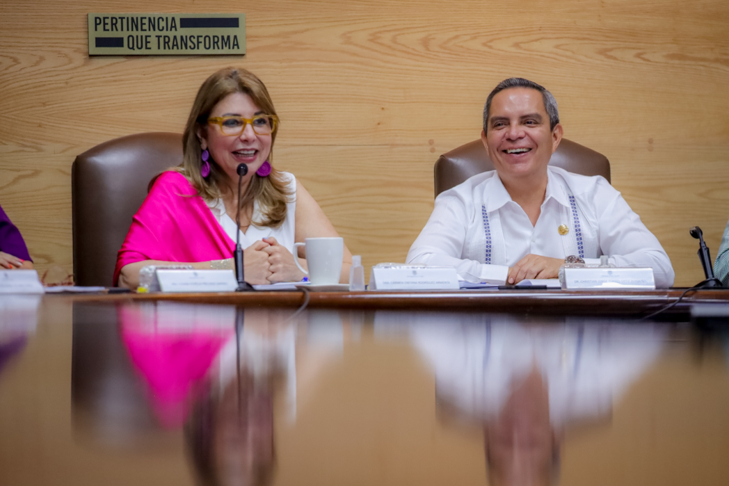 La mañana de este martes 19, en la sala de juntas de Rectoría de la Universidad de Colima, la doctora Carmen Rodríguez Armenta, directora general del Centro Nacional de Evaluación para la Educación Superior (Ceneval), sostuvo una reunión de trabajo con el rector Christian Jorge Torres Ortiz Zermeño, funcionarios y funcionarias del área educativa y con directivos de distintas facultades. Abordaron temas como los exámenes en línea, las microcredenciales, la colaboración de universitarios en el diseño de exámenes y sobre los próximos eventos que organizará este Centro y donde la UdeC puede participar.
