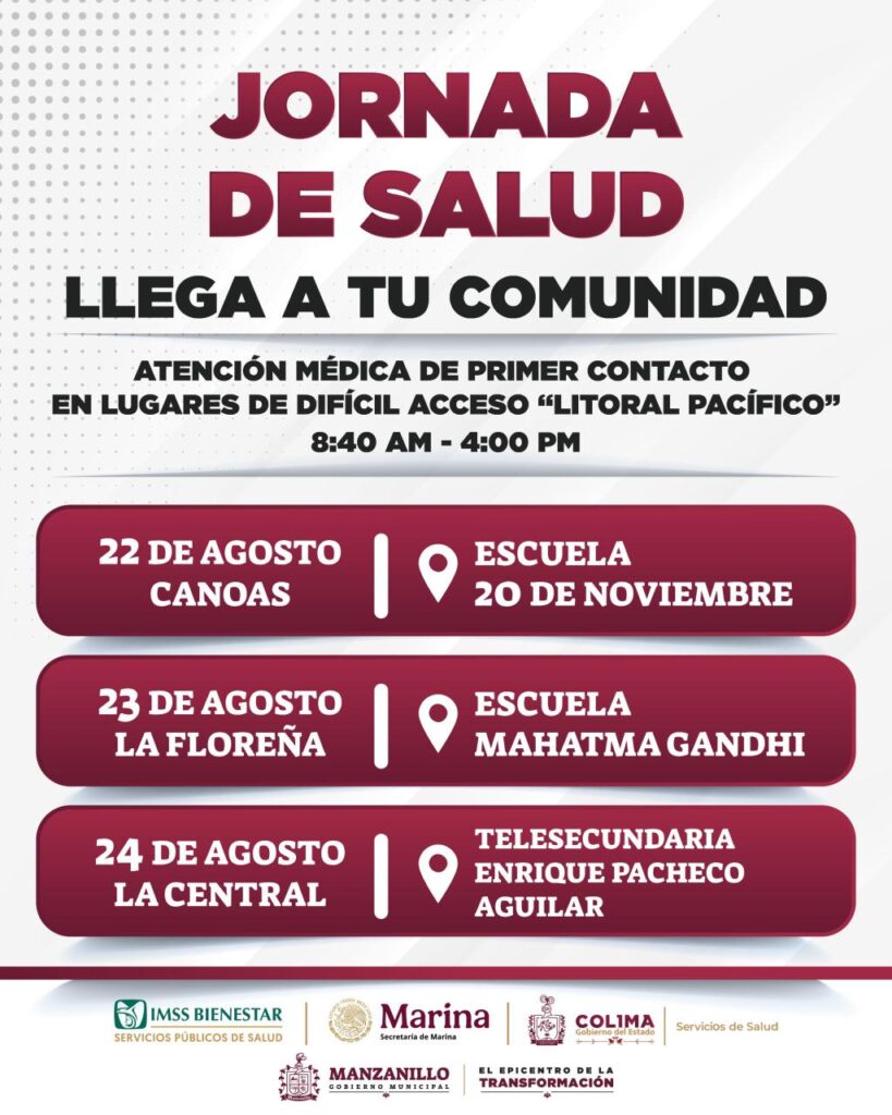 Estas jornadas se realizarán del 22 al 24 de agosto, en un horario de 8:30 de la mañana a 4 de la tarde, con el propósito de acercar servicios médicos esenciales a las familias de Manzanillo y garantizar su derecho a la salud.