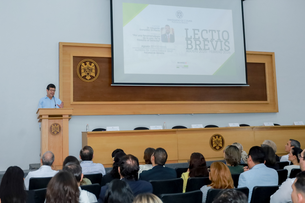 Este viernes por la tarde, en el auditorio de la Facultad de Derecho de la Universidad de Colima, campus Norte, se impartió la Lectio Brevis: “Por una fenomenología de la paz. De la Filosofía al Derecho”, a cargo de Eduardo González Di Pierro, profesor investigador de la Universidad Michoacana de San Nicolás de Hidalgo. Este acto marca el inicio formal del semestre en este plantel y contó con la presencia del rector Christian Jorge Torres Ortiz Zermeño, así como con de autoridades académicas y estudiantes.