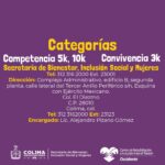 El recorrido de la carrera de convivencia (3 km) iniciará en la unidad deportiva ‘Morelos’, hacia el norte por avenida Camino Real, retornará hacia el sur en las oficinas de Ciapacov hasta llegar al hotel María Isabel, donde estará el retorno otra vez hacia el norte por Camino Real y finalizará en la Unidad Morelos; es decir, un circuito.