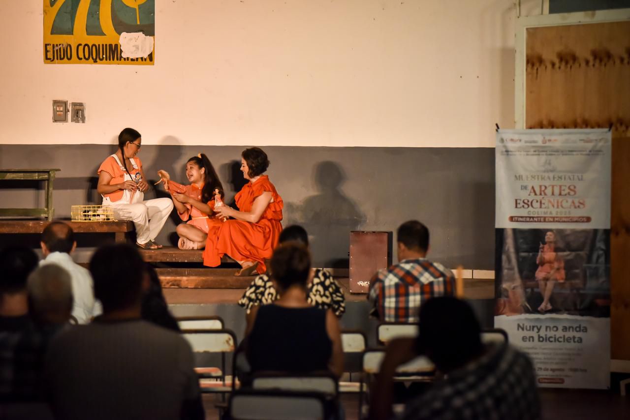 El recorrido a través del estado comenzó en Coquimatlán, con la obra ‘Nury no anda en bicicleta’ de la compañía Puercoespines Teatro, protagonizada por Rosario Gómez, Aurora Gónzalez y Nury Sandoval, y dirigida por Héctor Castañeda Arceo. Una puesta en escena construida con relatos y memorias verídicas sobre las figuras paternas de las actrices protagónicas, que invita al público a resignificar las heridas de la infancia y entender las emociones que se guardan sin saber.