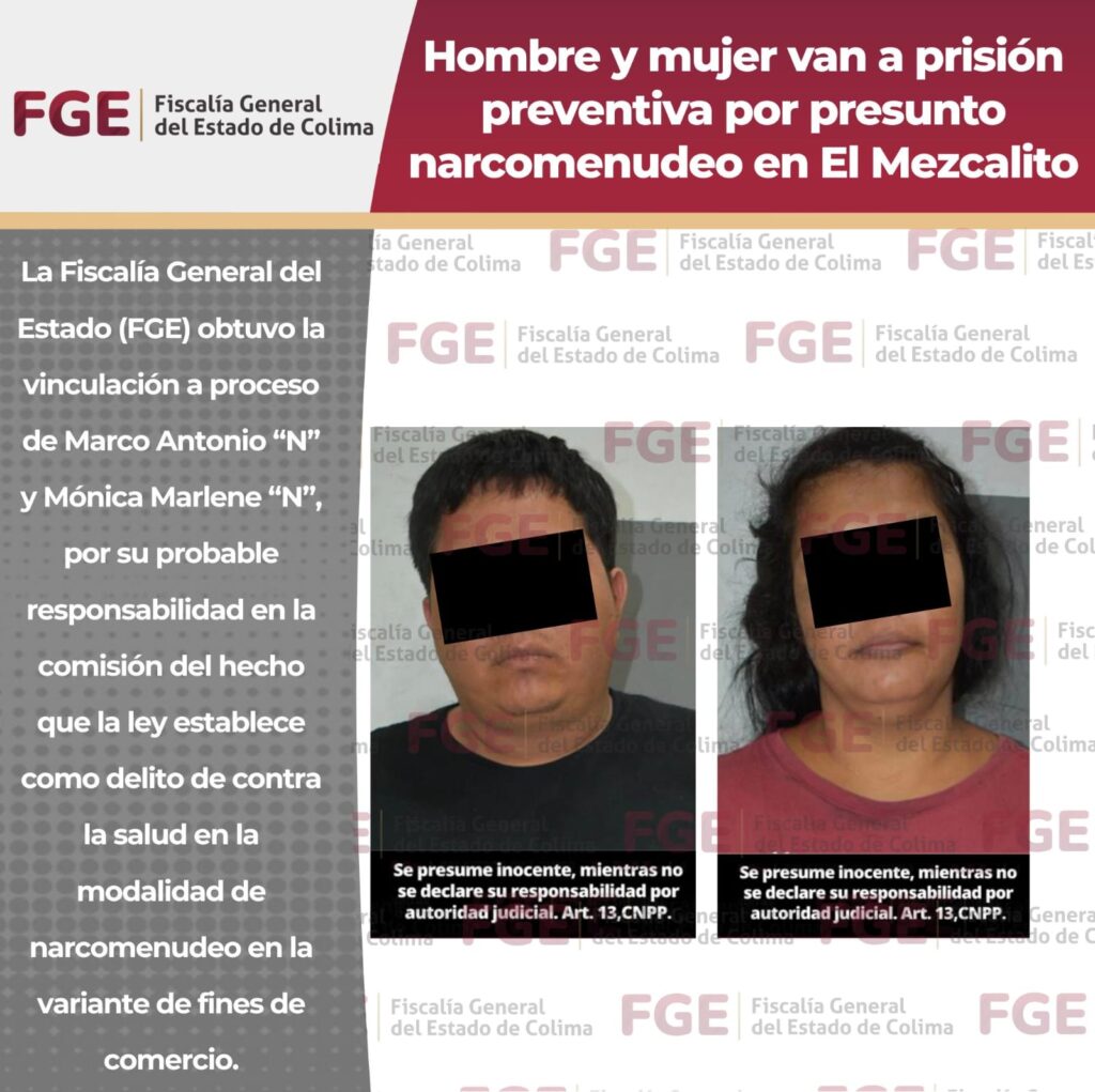 La Fiscalía General del Estado (FGE) obtuvo la vinculación a proceso de Marco Antonio “N” y Mónica Marlene “N”, por su probable responsabilidad en la comisión del hecho que la ley establece como delito de contra la salud en la modalidad de narcomenudeo en la variante de fines de comercio.