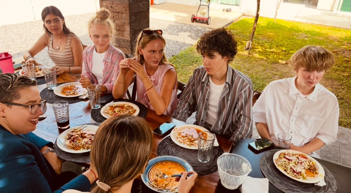 Posteriormente, la comunidad comalteca ofreció a los visitantes una experiencia auténtica y cálida. La familia Beltrán Ruiz, padres de una estudiante del plantel, abrió las puertas de su hogar para ofrecer una comida tradicional con sopitos, platillo típico de la región. Esta convivencia permitió a los jóvenes visitantes conocer de cerca las dinámicas familiares y la hospitalidad de Comala.
