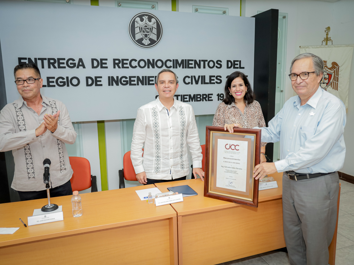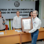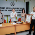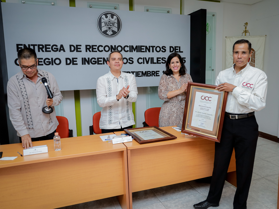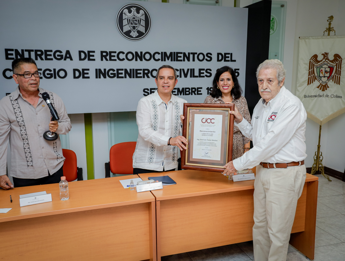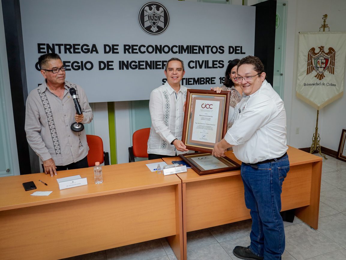 Este viernes, en el campus universitario, el Colegio de Ingenieros Civiles del Estado de Colima entregó reconocimientos a ocho de sus miembros destacados, entre ellos seis exdirectores de la Facultad de Ingeniería Civil de la Universidad de Colima (UdeC). La ceremonia estuvo presidida por Christian Jorge Torres Ortiz Zermeño, rector de la UdeC; Hugo Saucedo Acosta, presidente del Colegio, y Carolina Venegas Ochoa, presidenta de la Federación de Egresados de esta universidad (FEUC).