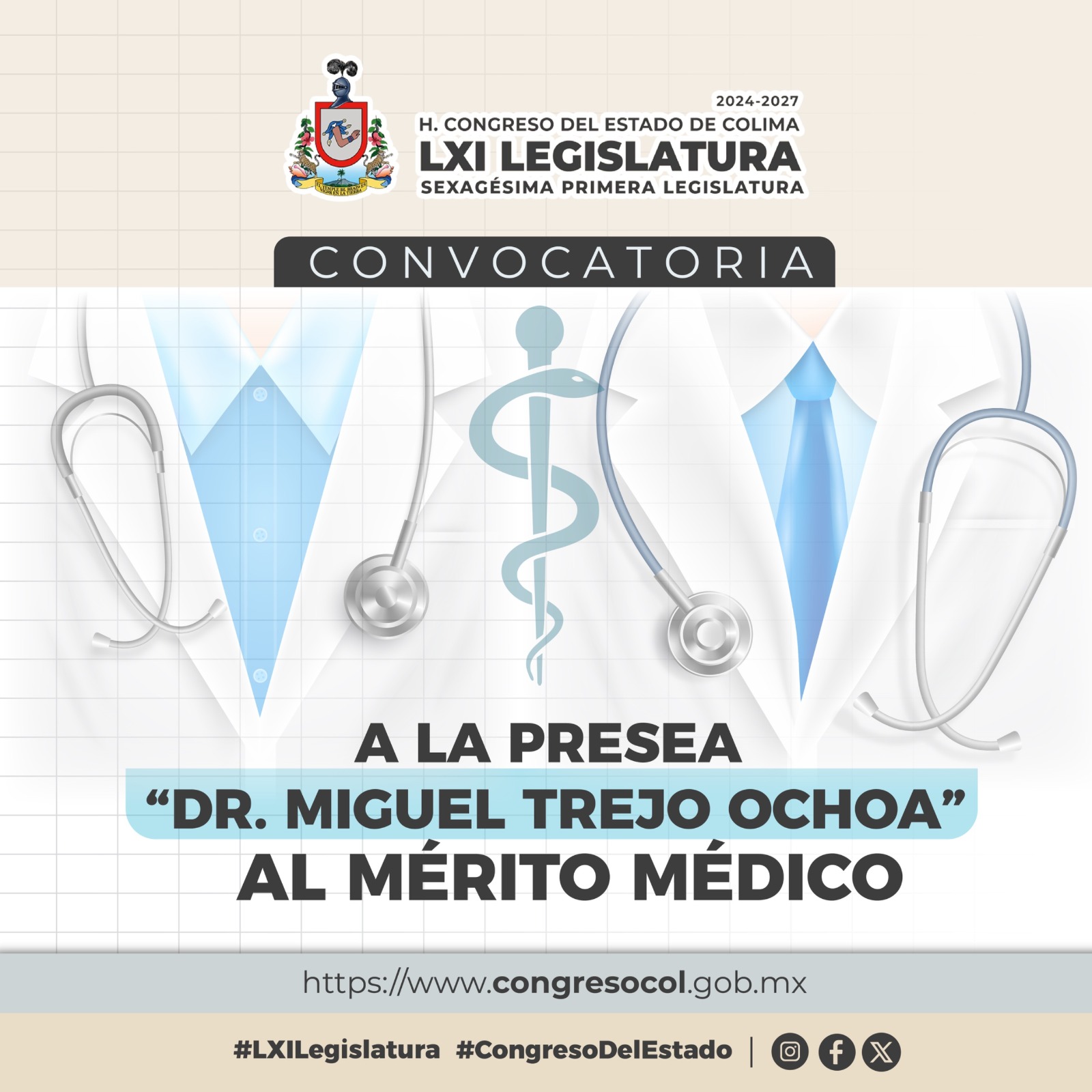 El H. Congreso del Estado de Colima, invita a las y los profesionales de la salud, a participar en la convocatoria 2025 de la Presea “Dr. Miguel Trejo Ochoa”, la cual se entregará aquellas personas que tengan una destacada trayectoria y aportaciones en el ámbito médico en Colima.