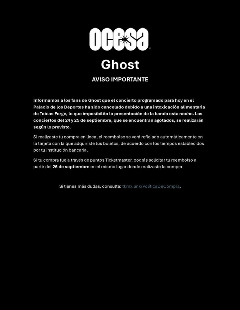 La noche de este 23 de septiembre, a tan solo unos minutos de dar inicio y con los fans listos para ocupar sus lugares en el Palacio de los Deportes, la banda sueca de metal Ghost canceló el primero de sus tres conciertos programados en la Ciudad de México.