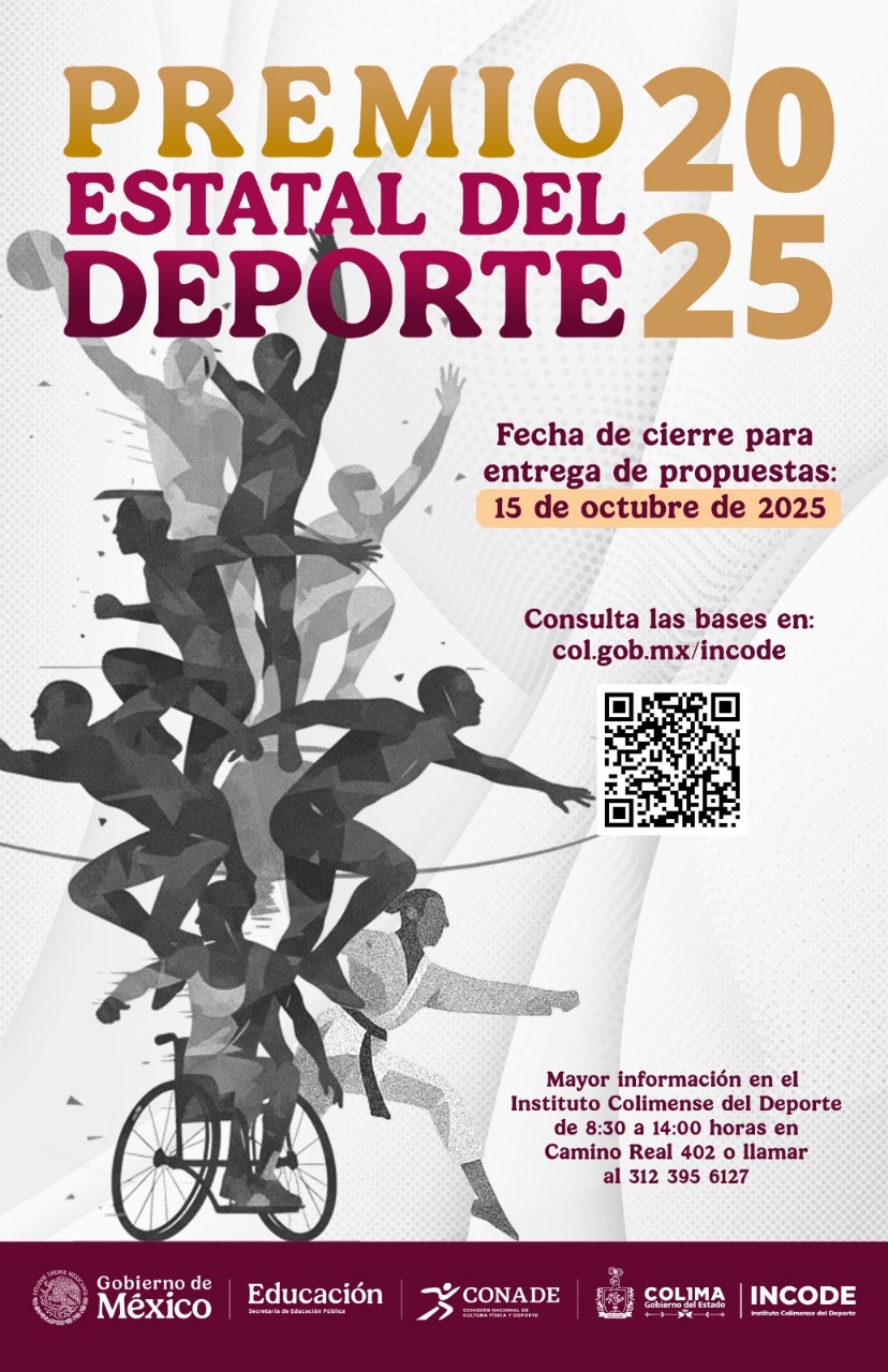El Gobierno del Estado de Colima que encabeza Indira Vizcaíno Silva, a través del Instituto Colimense del Deporte (Incode), en coordinación con la Comisión Nacional de Cultura Física y Deporte (Conade), invitan a participar en el Premio Estatal del Deporte 2025, para reconocer la labor de deportistas, quienes les entrenan, así como las y los promotores deportivos en la entidad.