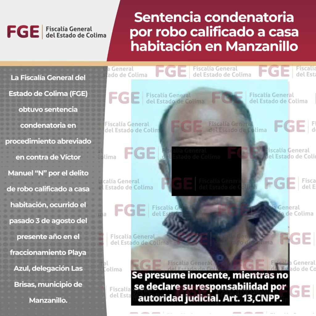 La Fiscalía General del Estado de Colima (FGE) obtuvo sentencia condenatoria en procedimiento abreviado en contra de Víctor Manuel “N” por el delito de robo calificado a casa habitación, ocurrido el pasado 3 de agosto del presente año en el fraccionamiento Playa Azul, delegación Las Brisas, municipio de Manzanillo.