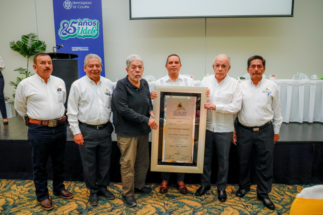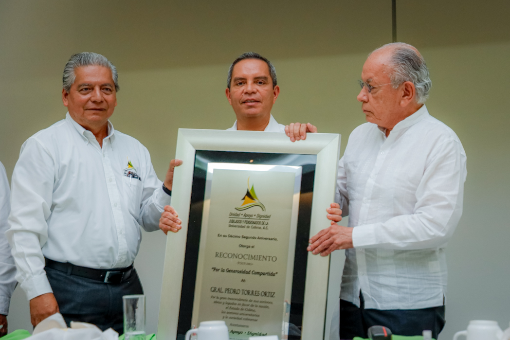 Este martes, la Asociación de jubilados y pensionados de la Universidad de Colima, al celebrar su décimo segundo aniversario, otorgó el reconocimiento “Por la generosidad compartida” -de manera póstuma- al General Pedro Torres Ortiz “por la gran trascendencia de sus acciones, obras y legados en favor de la nación, el estado de Colima, los sectores universitarios y la sociedad colimense”. En nombre de la familia, recibió el reconocimiento el Dr. Christian Torres Ortiz Ocampo, hijo del general.
